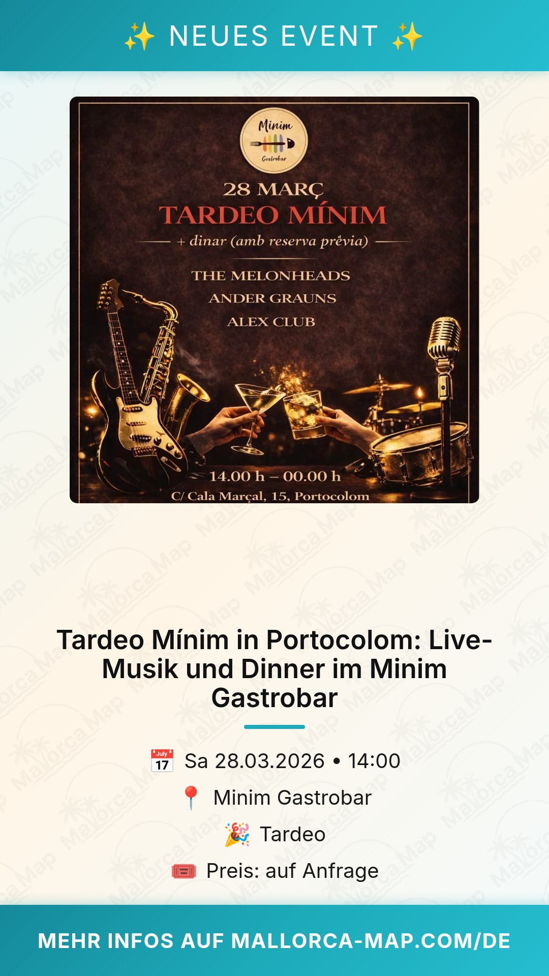 Bist du bereit für einen unvergesslichen Samstagnachmittag in Portocolom? Das Tardeo Mínim im Minim Gastrobar lädt dich herzlich ein, den Alltag hinter dir zu lassen und in eine Welt voller Rhythmus, Genuss und mediterraner Lebensfreude einzutauchen. Am 28. März 2026 verwandelt sich die bekannte Location in der Calle Cala Marçal 15 in den ultimativen Treffpunkt für alle, die gute Musik und eine erstklassige Atmosphäre schätzen.