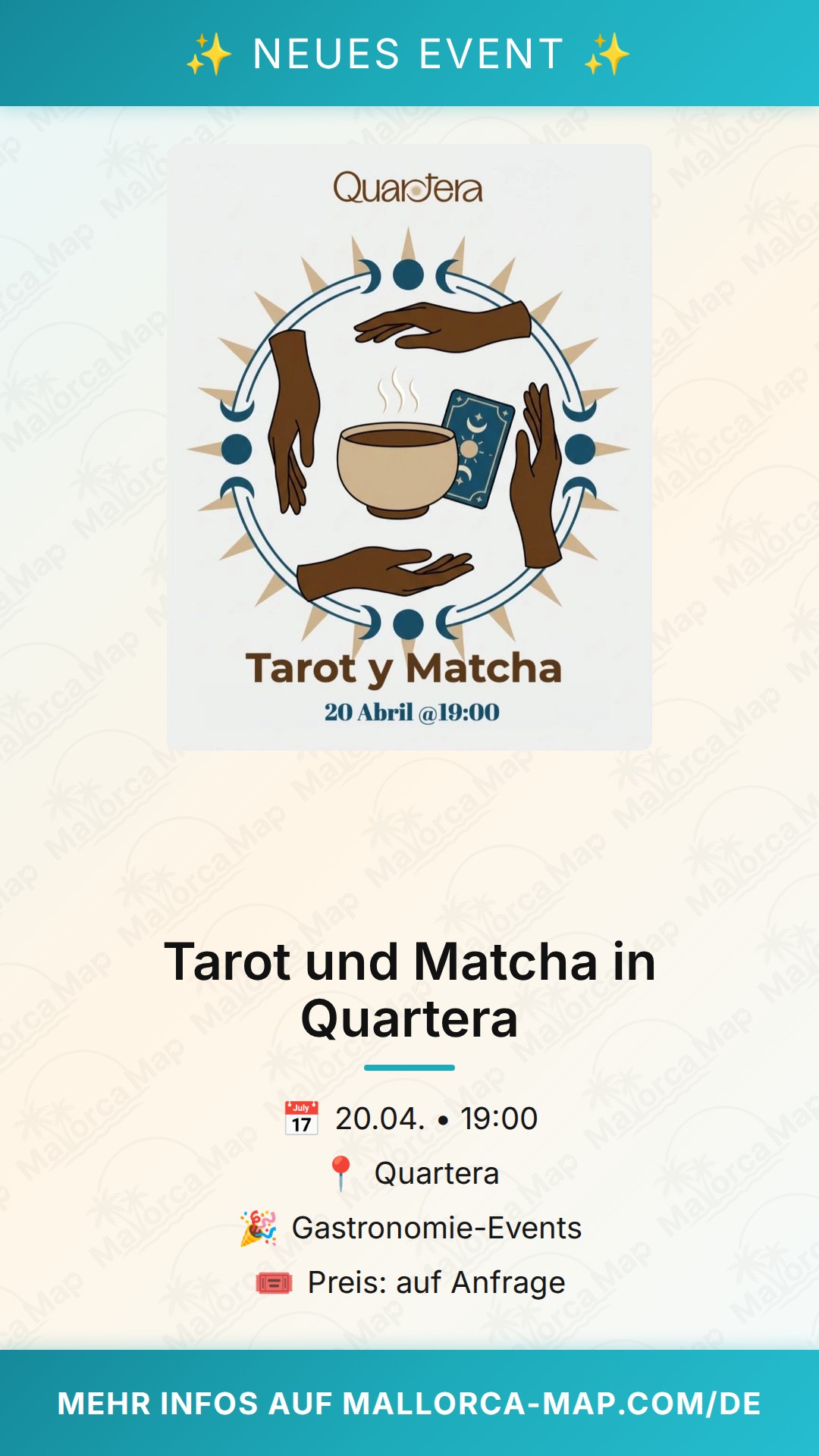 Sichere dir deinen Platz für diesen magischen Abend ab 19:00 Uhr. Da wir Wert auf eine persönliche und vertrauensvolle Atmosphäre legen, sind die Plätze limitiert. Verpasse nicht die Gelegenheit, Teil dieses besonderen Erlebnisses in Quartera zu sein. Wir freuen uns darauf, dich bei 'Tarot und Matcha' begrüßen zu dürfen und gemeinsam einen Abend voller Tiefe und Genuss zu verbringen.