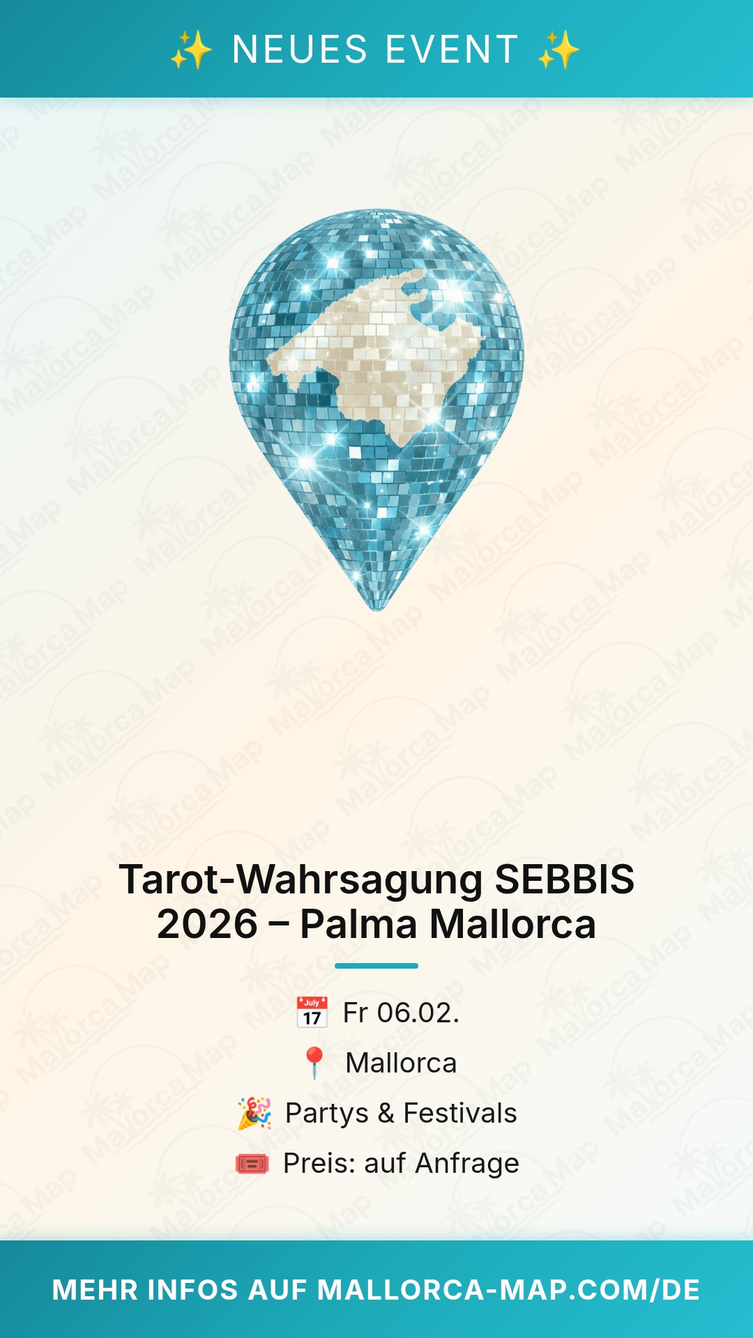 Tauche ein in die faszinierende Welt der Spiritualität bei der Tarot-Wahrsagung SEBBIS 2026 in der Inselhauptstadt Palma. Am 6. Februar erwartet dich ein besonderes Event, das weit über eine gewöhnliche Vorhersage hinausgeht. Du hast die Chance, tief in deine eigene Intuition einzutauchen und durch die Kunst des Kartenlegens wertvolle spirituelle Impulse für dein Jahr 2026 zu sammeln. Mallorca bietet hierfür die perfekte, energetische Kulisse, um den Alltag hinter dir zu lassen und dich ganz auf deine persönlichen Fragen und Wünsche zu konzentrieren.