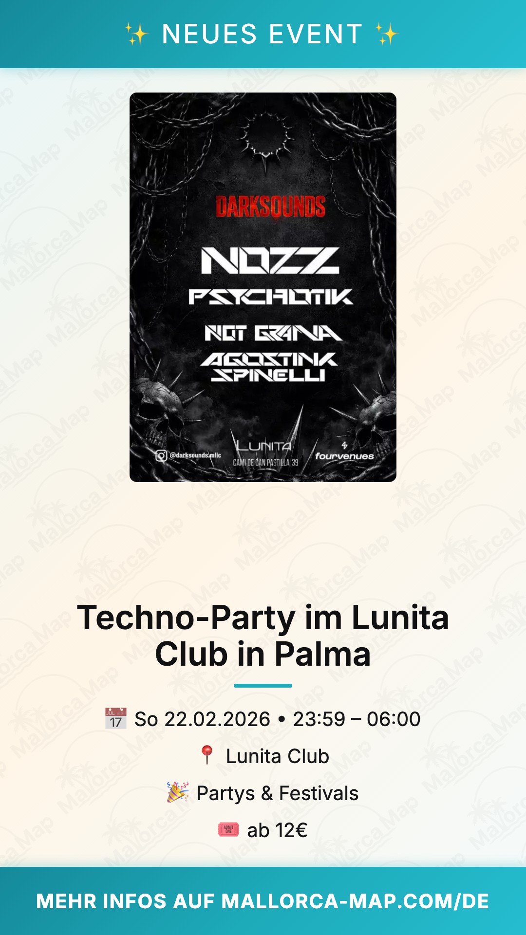 Bist du bereit, die Nacht zum Tag zu machen und dich in den hypnotischen Tiefen der elektronischen Musik zu verlieren? Wenn am 21. Februar 2026 die Zeiger auf 23:59 Uhr rücken, öffnet der legendäre Lunita Club in Palma seine Türen für ein Event, das dein Herz höherschlagen lässt. Die Techno-Party im Stadtteil Can Pastilla verspricht eine Reise durch dunkle, treibende Klangwelten, die speziell für echte Liebhaber des Genres kuratiert wurden.