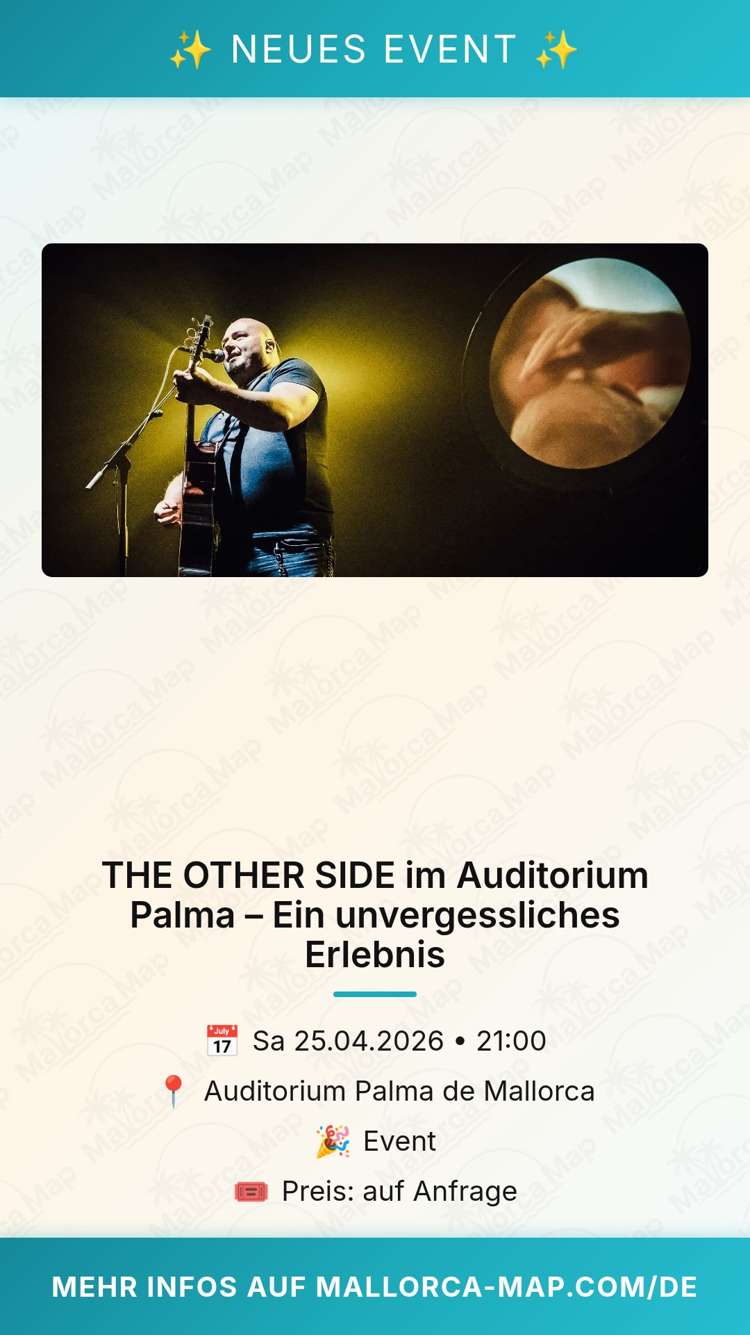 Wir empfehlen dir, deine Tickets rechtzeitig zu sichern, da Veranstaltungen in dieser beliebten Location schnell ausverkauft sein können. Verbinde deinen Besuch im Auditorium doch mit einem entspannten Spaziergang entlang des Paseo Marítimo, um den Abend perfekt ausklingen zu lassen. Palma bietet dir eine wunderbare Kulisse für unvergessliche Momente. Worauf wartest du noch? Plane deinen Besuch für den 25. April 2026 und sei dabei, wenn es heißt: Vorhang auf für THE OTHER SIDE. Wir freuen uns darauf, dich dort zu sehen und gemeinsam einen kulturell anspruchsvollen Abend zu erleben. Sichere dir jetzt deinen Platz und freue dich auf ein Event, das dir noch lange in guter Erinnerung bleiben wird. Es ist die perfekte Gelegenheit, die kulturelle Vielfalt Mallorcas in einem der exklusivsten Häuser der Stadt hautnah zu erleben.