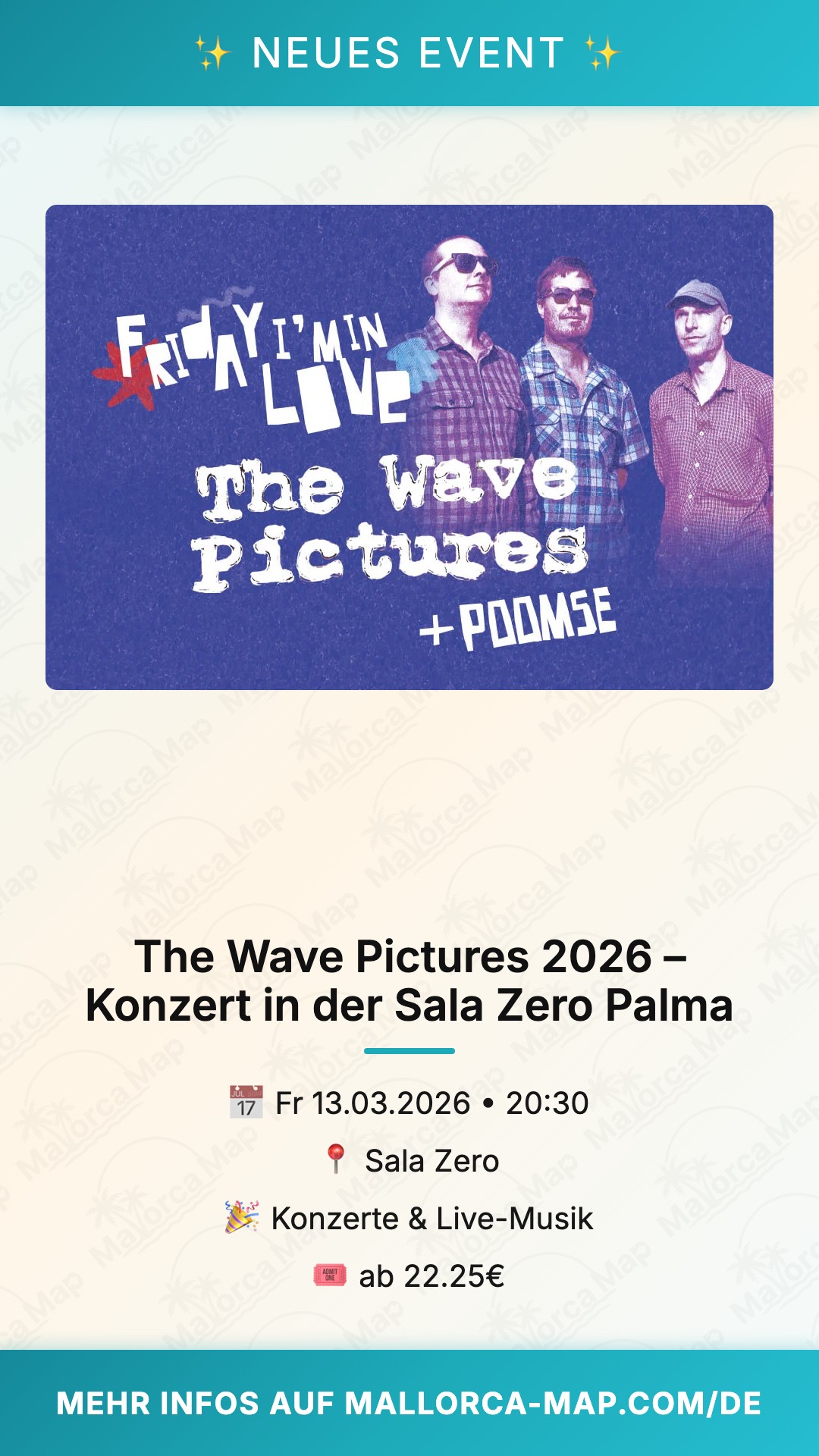 Du erlebst am Freitag, den 13. März 2026, eine musikalische Sternstunde in der Sala Zero im bekannten Kulturzentrum Es Gremi in Palma. Die britische Kultband The Wave Pictures stattet Mallorca im Rahmen der beliebten Veranstaltungsreihe Friday I’m In Love einen Besuch ab und bringt ihren unverkennbaren Sound direkt in das Herz der Inselhauptstadt. Wenn du handgemachte Musik liebst, die zwischen klassischem Rock, jazzigen Elementen und tiefem Blues pendelt, dann ist dieses Konzert ein absoluter Pflichttermin in deinem Kalender.