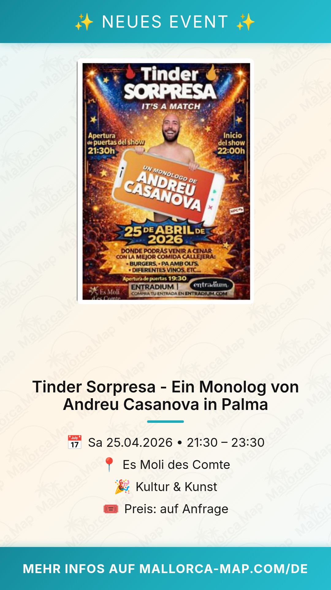 Vergiss nicht, rechtzeitig zu erscheinen, um die Kulinarik in vollen Zügen zu genießen, bevor die Show beginnt. Die Mischung aus Kultur, Comedy und Gastronomie ist in dieser Form einzigartig auf der Insel. Pack deine Freunde ein oder komm allein und lerne neue Leute kennen – wer weiß, vielleicht ist dieser Abend ja auch eine echte „Tinder Sorpresa“ für dich. Wir sehen uns in Palma zu einem unvergesslichen Abend voller Humor und Genuss!