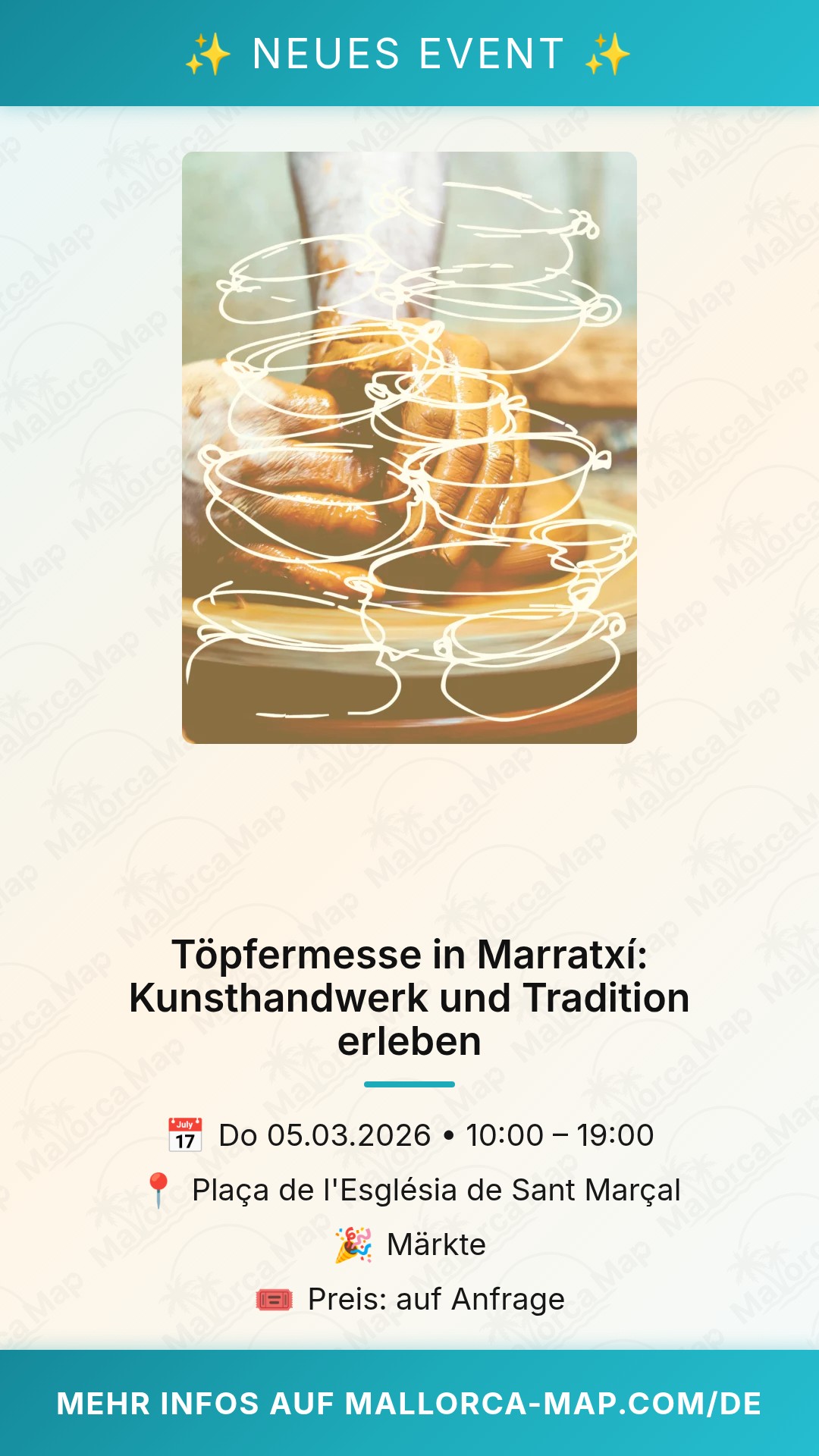 Die Töpfermesse ist mehr als nur ein einfacher Markt; sie ist ein kulturelles Ereignis, das die Geschichte Marratxís lebendig hält. Pack deine Freunde oder die Familie ein und verbringe einen inspirierenden Tag auf der Plaça de Sant Marçal. Ob du auf der Suche nach einem besonderen, handgemachten Souvenir für dein Zuhause bist oder einfach nur das Flair, die Ausstellungen und die Musik genießen möchtest – hier wirst du garantiert fündig. Wir sehen uns in Marratxí, wo die Erde zum Leben erweckt wird!