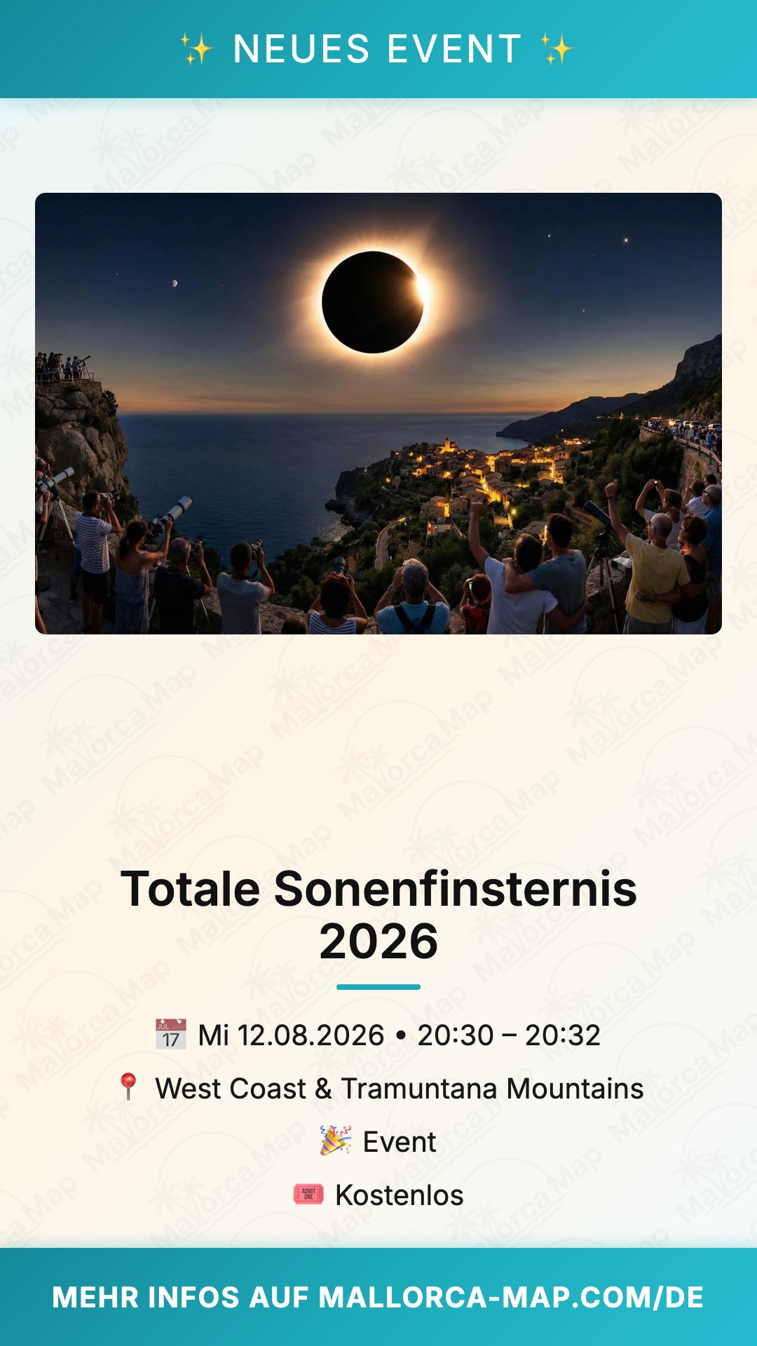 Dieses Naturschauspiel ist ideal für Naturfotografen, Astronomie-Begeisterte und Familien, die gemeinsam einen magischen Moment unter freiem Himmel verbringen möchten. Die Atmosphäre ist geprägt von einer ehrfürchtigen Stille, wenn die Temperaturen spürbar sinken und die Natur kurzzeitig in den Nachtmodus wechselt. Es ist ein Gemeinschaftserlebnis, das Menschen an den Aussichtspunkten von Andratx bis nach Sóller verbindet. Die Westküste Mallorcas wird an diesem Abend zum Treffpunkt für Entdecker, die das Besondere suchen und die Insel von ihrer spirituellen und wilden Seite kennenlernen wollen.
