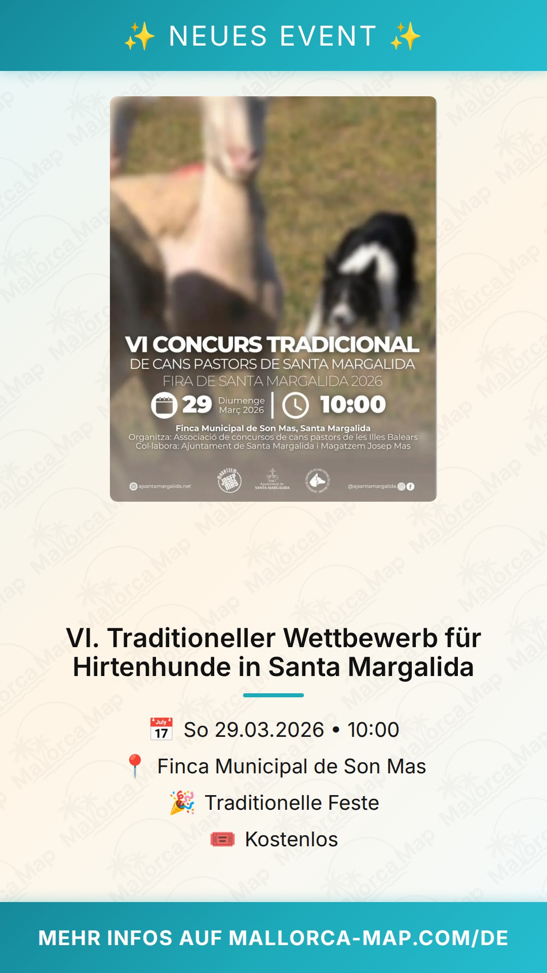 Bist du bereit für ein echtes Stück mallorquinischer Tradition? Am 29. März 2026 verwandelt sich die Finca Municipal de Son Mas in Santa Margalida in einen faszinierenden Schauplatz für Geschicklichkeit und jahrhundertealte Bräuche. Der VI. Concurs Tradicional de Cans Pastors lädt dich ein, die beeindruckende Arbeit der Hirtenhunde aus nächster Nähe zu erleben. Dieses Event ist tief in der lokalen Kultur verwurzelt und bietet dir eine authentische Erfahrung, die du so schnell nicht vergessen wirst.