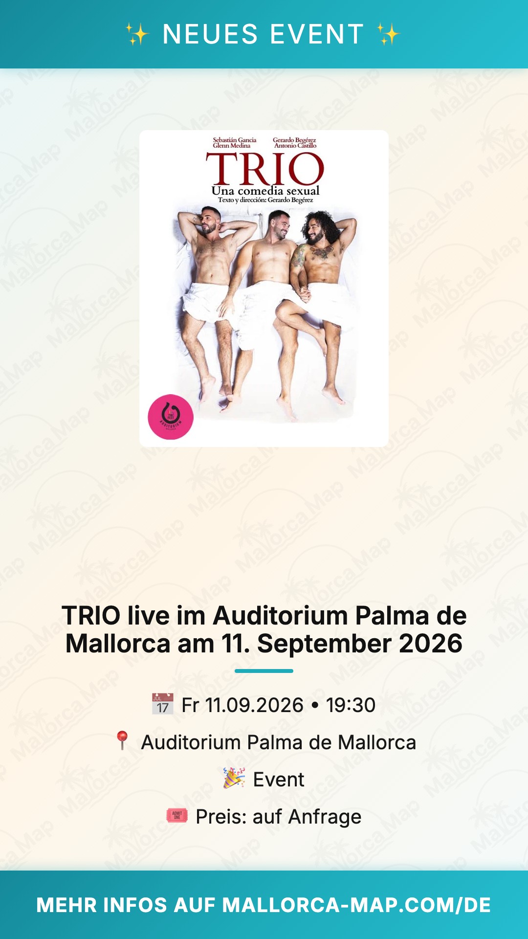Bist du bereit für einen unvergesslichen Abend voller Musik und Leidenschaft in Palma? Am 11. September 2026 erwartet dich ein ganz besonderes Highlight im berühmten Auditorium Palma de Mallorca: Das Ensemble TRIO tritt live auf und lädt dich ein, in ihre Klangwelten einzutauchen. Wenn du hochwertige Live-Musik in einer der beeindruckendsten Locations der Inselhauptstadt erleben möchtest, ist dieser Termin ein absolutes Muss in deinem Kalender.