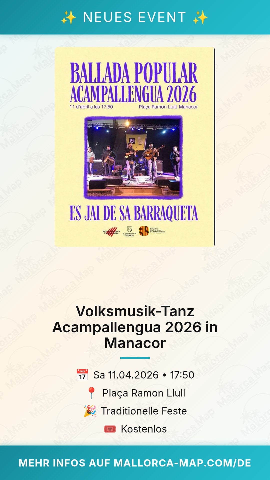 Die Plaça Ramon Llull bietet die perfekte Kulisse für diesen besonderen Nachmittag. Inmitten des Herzens der Stadt kannst du die authentische Atmosphäre genießen, während die Sonne langsam tiefer sinkt und die Musik den Platz erfüllt. Da der Eintritt komplett frei ist, gibt es eigentlich keine Ausrede, nicht vorbeizuschauen. Es ist die ideale Gelegenheit, nach einem Bummel durch die historischen Gassen von Manacor den Tag mit einem kulturellen Paukenschlag ausklingen zu lassen. Pack deine Freunde ein, bring gute Laune mit und tauche ein in ein Stück echtes Mallorca. Wir sehen uns in Manacor!