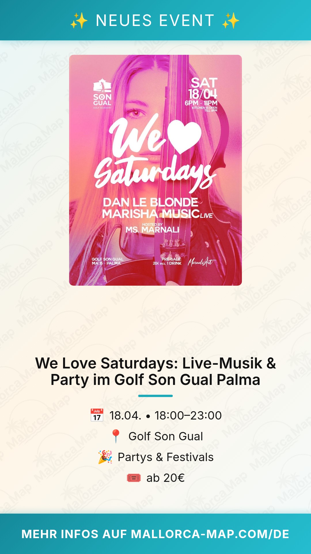 Sichere dir rechtzeitig deinen Platz, denn die Tickets sind begehrt. Mit einem Einstiegspreis von 20 Euro bietet "We Love Saturdays" ein exzellentes Preis-Leistungs-Verhältnis für einen Abend voller Entertainment in einer der schönsten Locations rund um Palma. Pack deine Freunde ein, zieh dein Lieblingsoutfit an und feiere mit uns den Frühling auf Mallorca. Wir sehen uns am 18. April ab 18:00 Uhr im Golf Son Gual – lass uns gemeinsam zeigen, warum wir Samstage so sehr lieben!