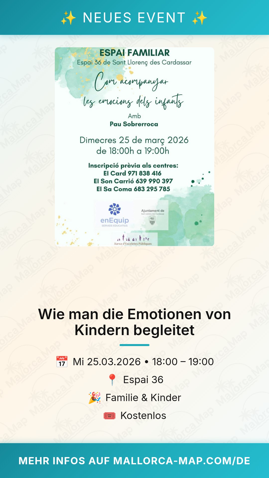 Der Vortrag beginnt um 18:00 Uhr. Wir empfehlen dir, etwas früher da zu sein, um dir einen guten Platz zu sichern und vielleicht schon vorab mit anderen Teilnehmern ins Gespräch zu kommen. Sant Llorenç des Cardassar ist zudem immer einen Besuch wert – verbinde den Abend doch mit einem kleinen Spaziergang durch den charmanten Ortskern, bevor du dich ganz dem Thema Erziehung widmest. Wir freuen uns darauf, dich bei diesem bereichernden Event begrüßen zu dürfen. Es ist ein kleiner Schritt für einen entspannteren Umgang mit den Kleinsten, aber ein großer Gewinn für das harmonische Miteinander in deiner Familie.