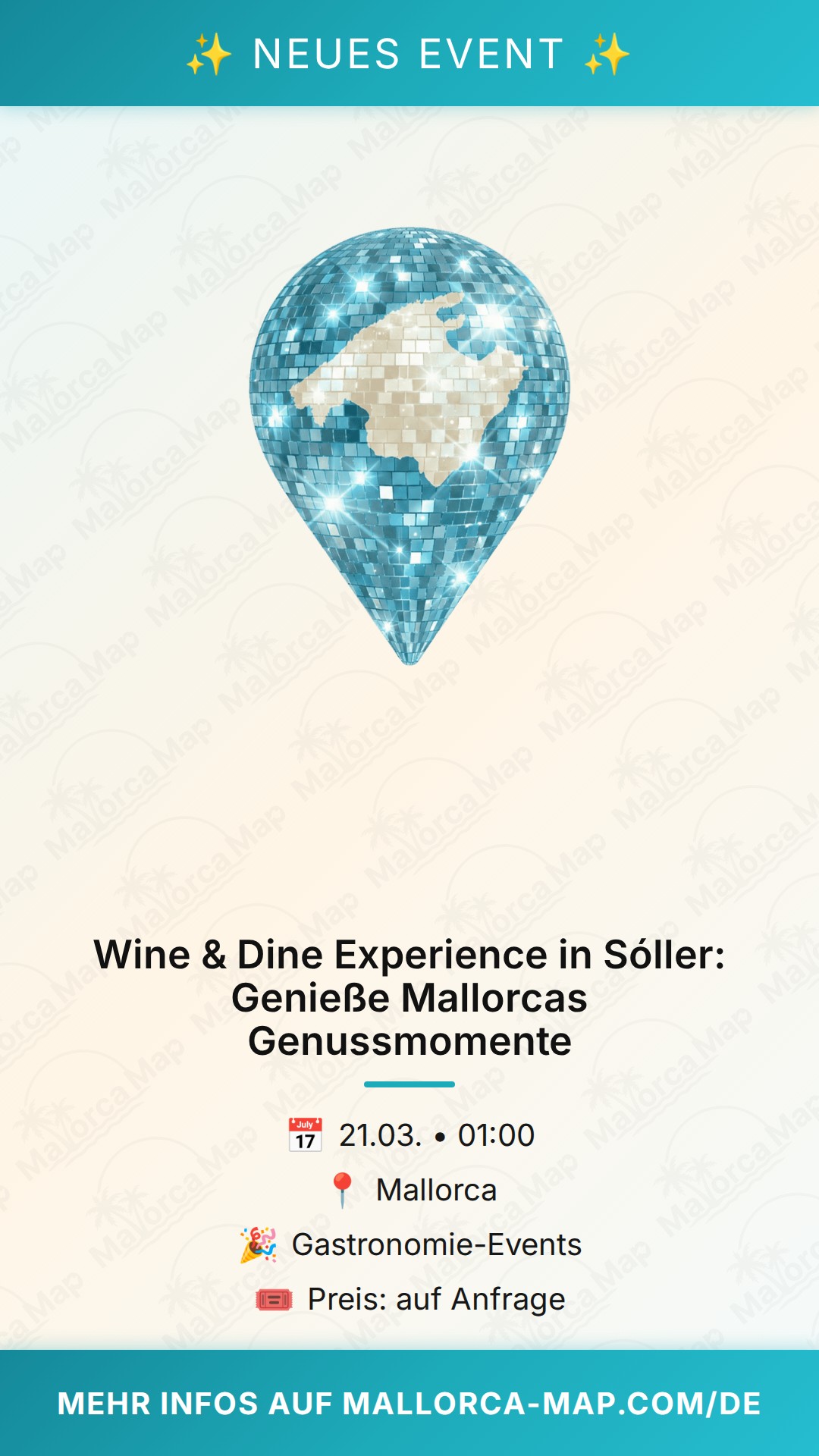 Klingt das nach einem Abend ganz nach deinem Geschmack? Dann reserviere dir am besten noch heute deinen Platz für diese Wine & Dine Experience. Erlebe Sóller abseits der klassischen Touristenpfade und gönn dir eine Auszeit, die deine Sinne verwöhnen wird. Wir freuen uns darauf, dich bei diesem kulinarischen Event begrüßen zu dürfen und gemeinsam auf einen wunderbaren Abend anzustoßen. Sichere dir jetzt dein Ticket und freue dich auf eine unvergessliche kulinarische Reise durch die Aromen Mallorcas.