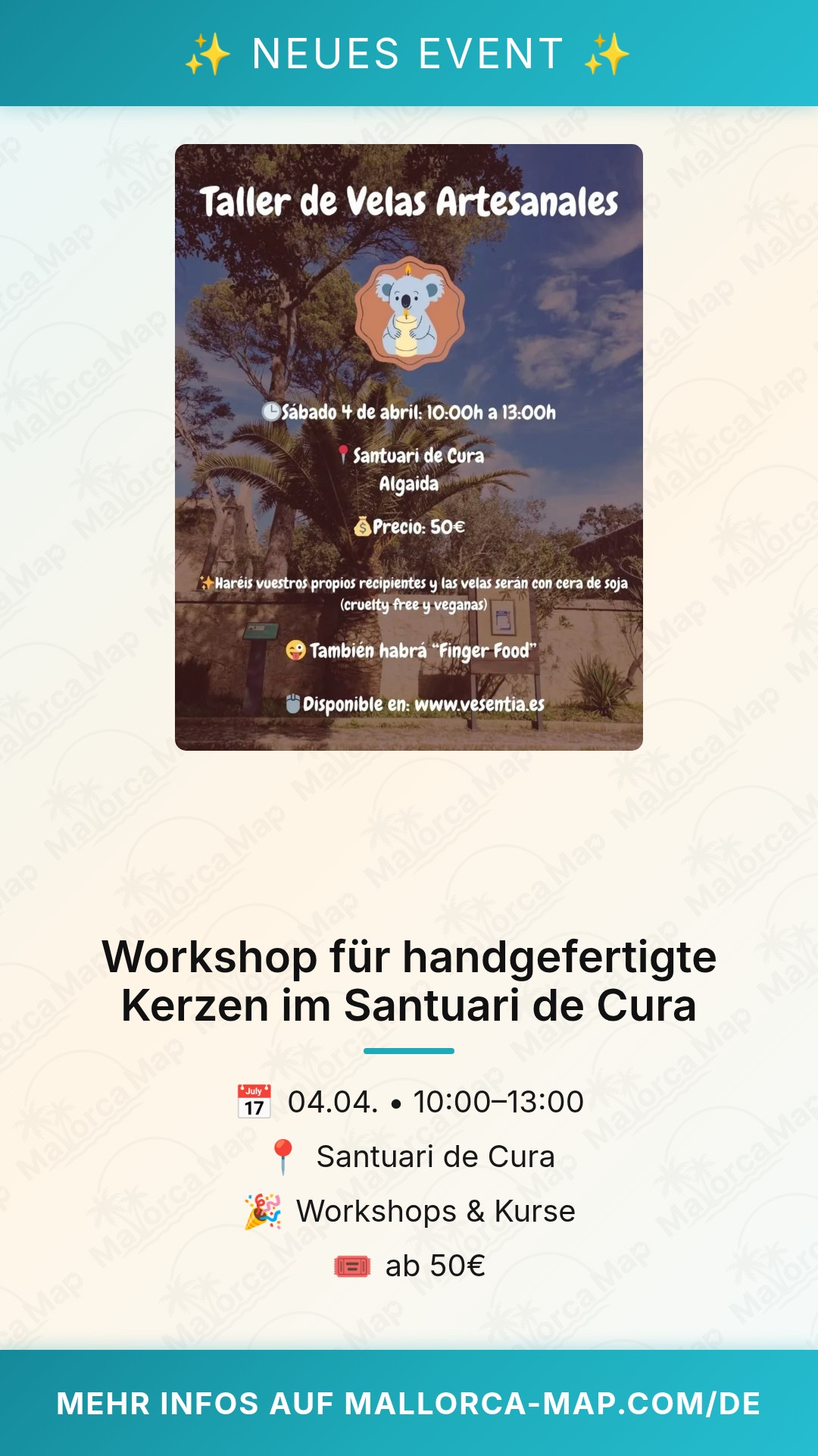 Der Workshop beginnt am 4. April 2026 um 10:00 Uhr. Für einen Beitrag von 50 Euro erhältst du nicht nur alle Materialien und das nötige Fachwissen, sondern nimmst auch ein echtes Stück mallorquinische Handwerkskunst mit nach Hause. Das Santuari de Cura bietet zudem eine atemberaubende Aussicht über die ganze Insel, was den Ausflug nach Algaida zusätzlich lohnenswert macht.