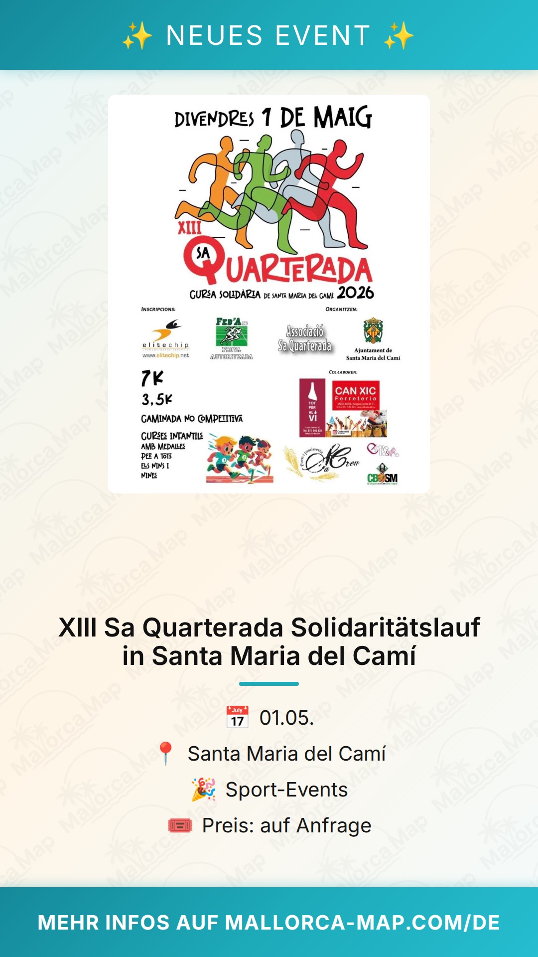 Bist du bereit, deine Laufschuhe für einen guten Zweck zu schnüren? Am 1. Mai 2026 verwandelt sich das malerische Dorf Santa Maria del Camí in eine lebendige Bühne für den XIII Sa Quarterada. Dieser traditionsreiche Solidaritätslauf ist weit mehr als nur ein sportlicher Wettkampf; er ist ein Fest der Gemeinschaft, das Läufer aller Altersgruppen und Leistungsniveaus zusammenbringt, um gemeinsam ein Zeichen zu setzen.
