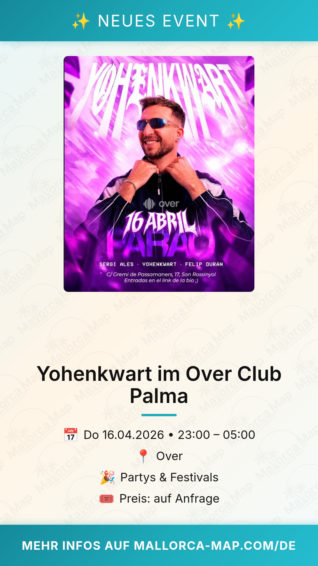 Bist du bereit für eine Nacht, die du so schnell nicht vergessen wirst? Am 16. April 2026 verwandelt sich der Over Club in Palma de Mallorca in das Epizentrum für alle Liebhaber elektronischer Beats und erstklassiger Club-Atmosphäre. Das Event Yohenkwart verspricht eine musikalische Reise, die tief in die Nacht führt und dich den Alltag komplett vergessen lässt.
