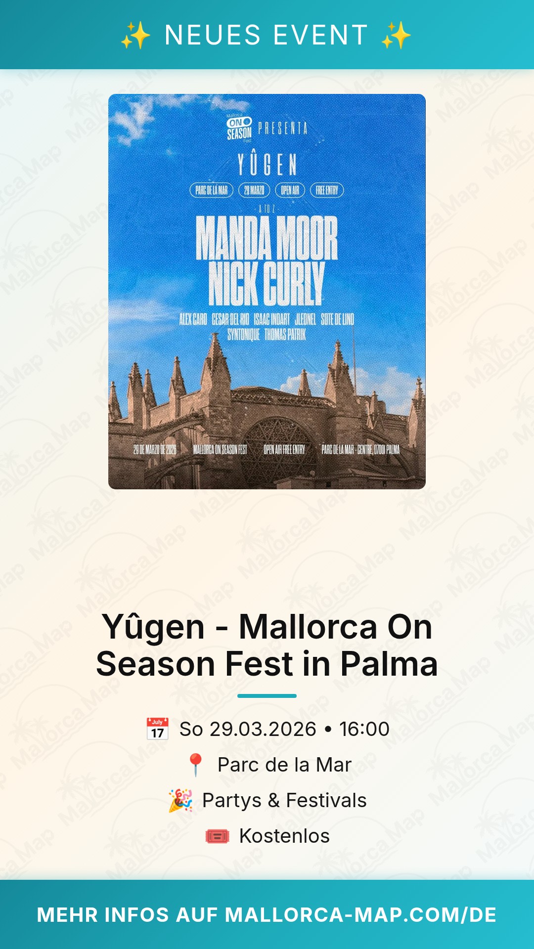 Bist du bereit, die neue Saison auf Mallorca mit erstklassigen elektronischen Beats einzuläuten? Dann solltest du dir das Yûgen - Mallorca On Season Fest am 29. März 2026 auf keinen Fall entgehen lassen. Direkt im Herzen von Palma, im malerischen Parc de la Mar unterhalb der majestätischen Kathedrale La Seu, erwartet dich ein Open-Air-Erlebnis der Extraklasse. Das Beste daran? Der Eintritt ist für dich komplett kostenlos, was dieses Festival zu einem der Highlights des frühen Frühlings macht.