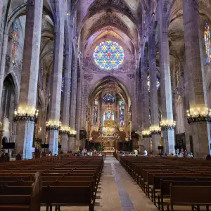 Im Inneren der Kathedrale umgibt dich eine Atmosphäre der Andacht und des Staunens. Die hohen Decken scheinen bis zum Himmel zu reichen, während das Sonnenlicht durch die bunten Glasfenster tanzende Muster auf den Boden wirft. Du fühlst die Geschichte in jeder Ecke – von den gotischen Skulpturen bis zu den modernen Installationen. Es ist, als ob die Zeit stillsteht, und du tauchst in eine Welt ein, die von mallorquinischer Kultur geprägt ist. Die ruhige Stimmung lädt zum Verweilen ein, sei es für einen Moment der Reflexion oder einfach um die Schönheit zu genießen.