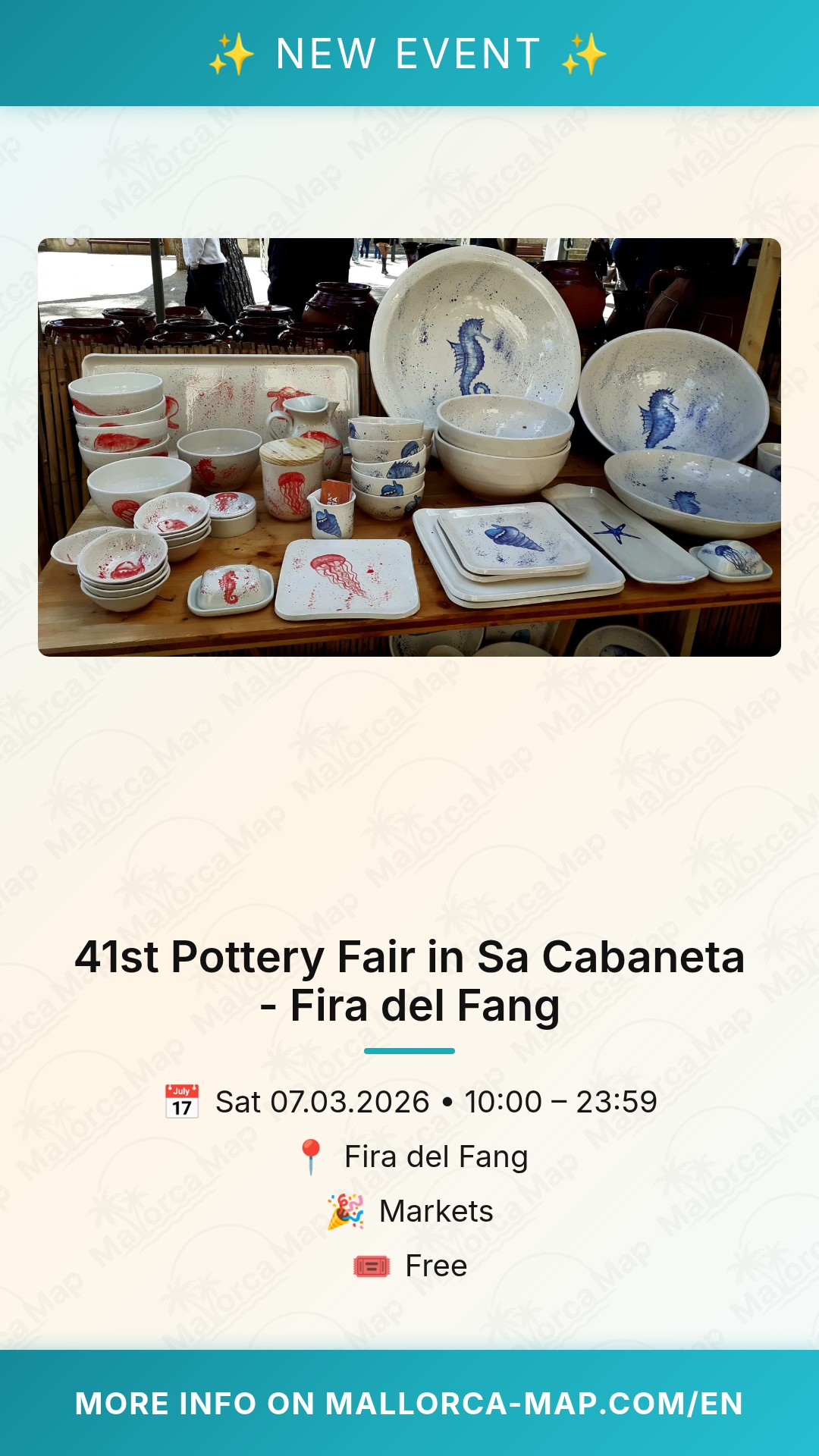 The fair is open from Monday to Friday between 10:00 AM and 1:00 PM, and again from 4:00 PM to 7:00 PM. On weekends, you can browse the stalls all day from 10:00 AM to 8:00 PM. Best of all, entry is free, making it an accessible and enriching day out for everyone. Head over to Sa Cabaneta this March and discover why pottery remains the soul of Marratxí. We hope to see you there!