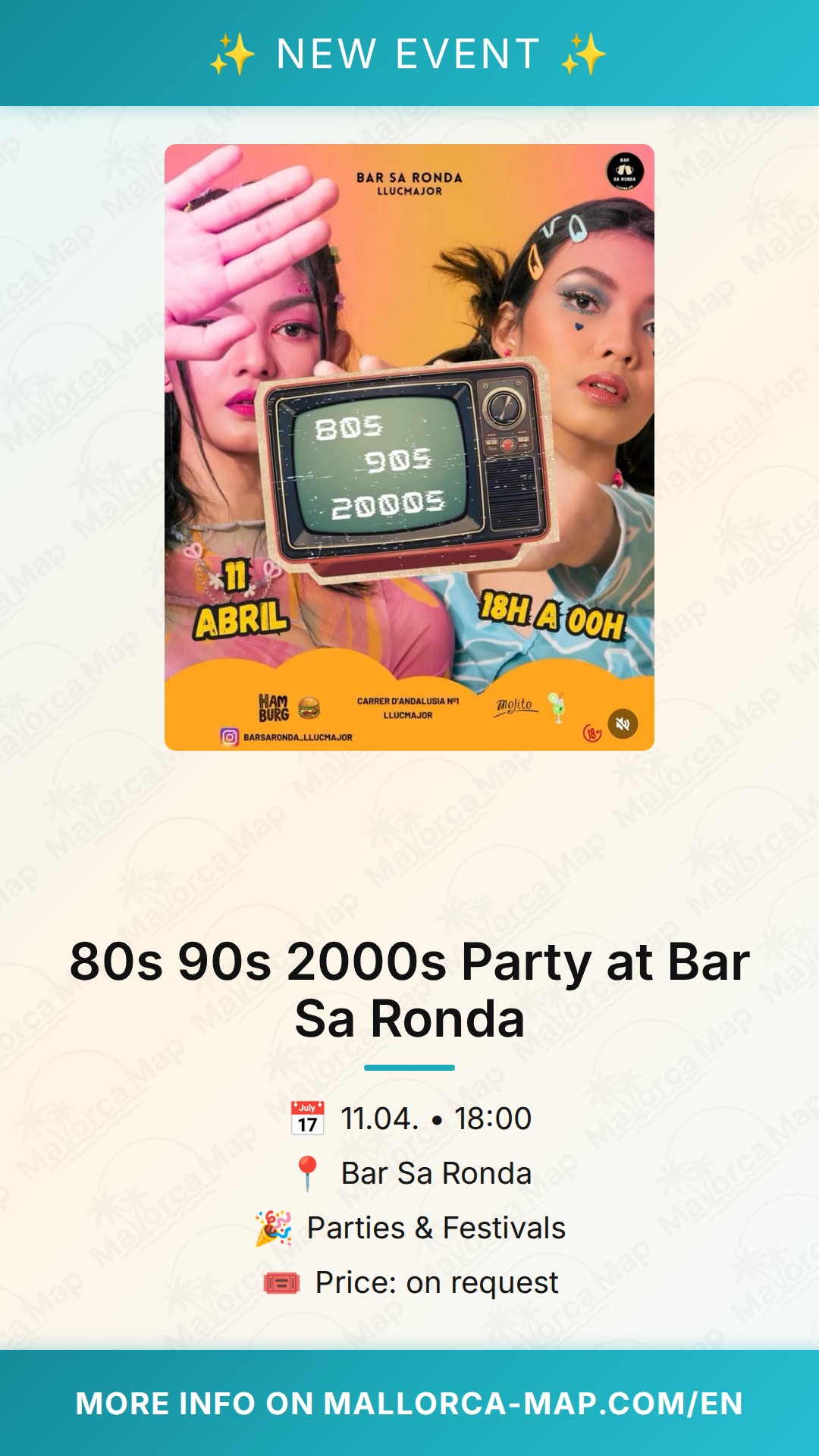 Don't miss this chance to relive the best musical moments of the last few decades. Mark your calendar for April 11th and join us at Bar Sa Ronda for the 80s 90s 2000s Party. It’s going to be a night to remember in the heart of Llucmajor. See you on the dance floor!