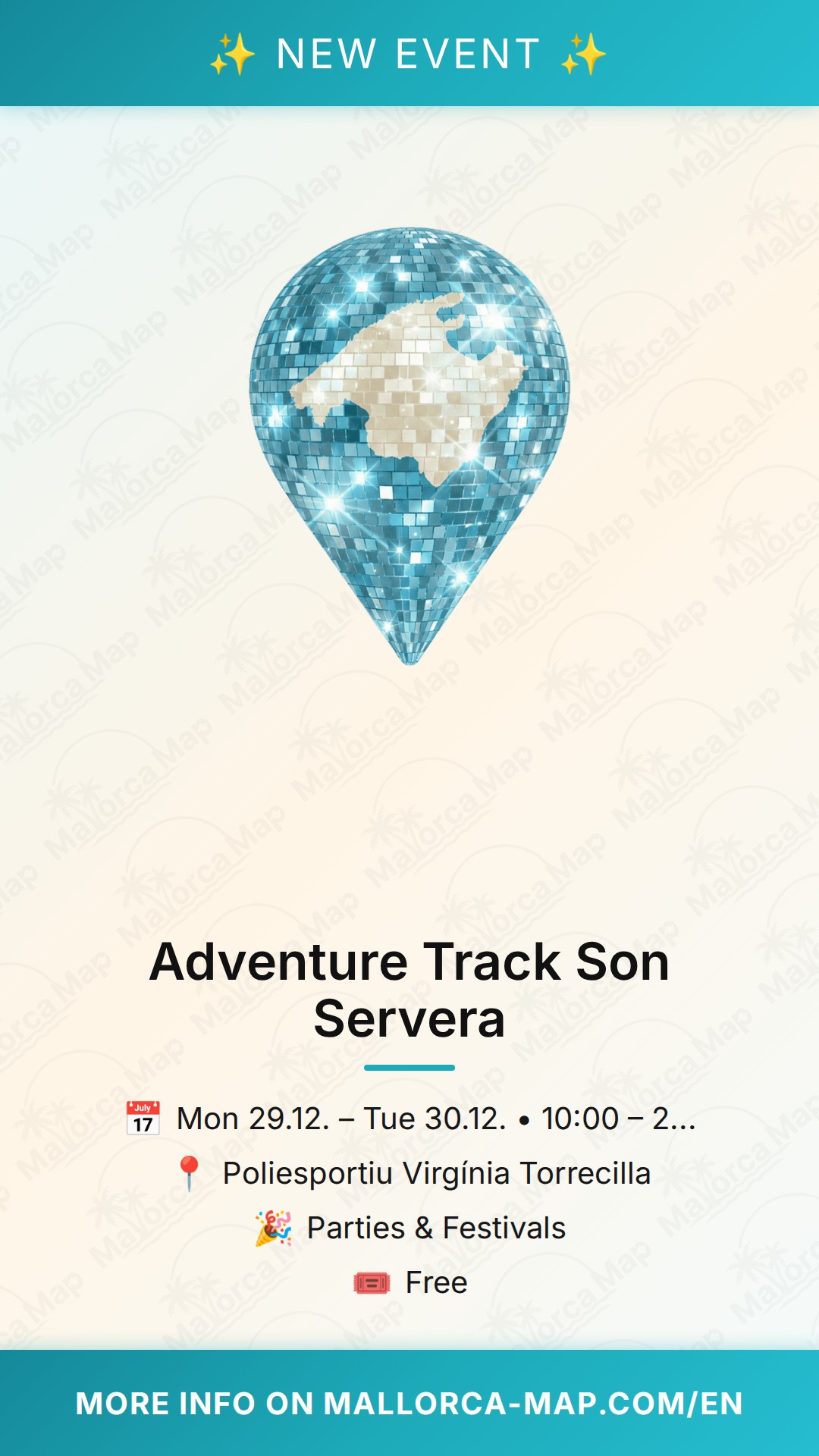 Dive into the fun of Adventure Track Son Servera on December 29th and 30th at Poliesportiu Virgínia Torrecilla in Son Servera, Mallorca. This family-friendly event kicks off at 10:00 AM each day, offering a packed schedule of excitement tailored for kids and parents alike. From giant inflatable castells that let little ones climb and play like pros to creative make-up workshops, you'll find endless ways to spark joy under the winter sun of Mallorca's east coast.