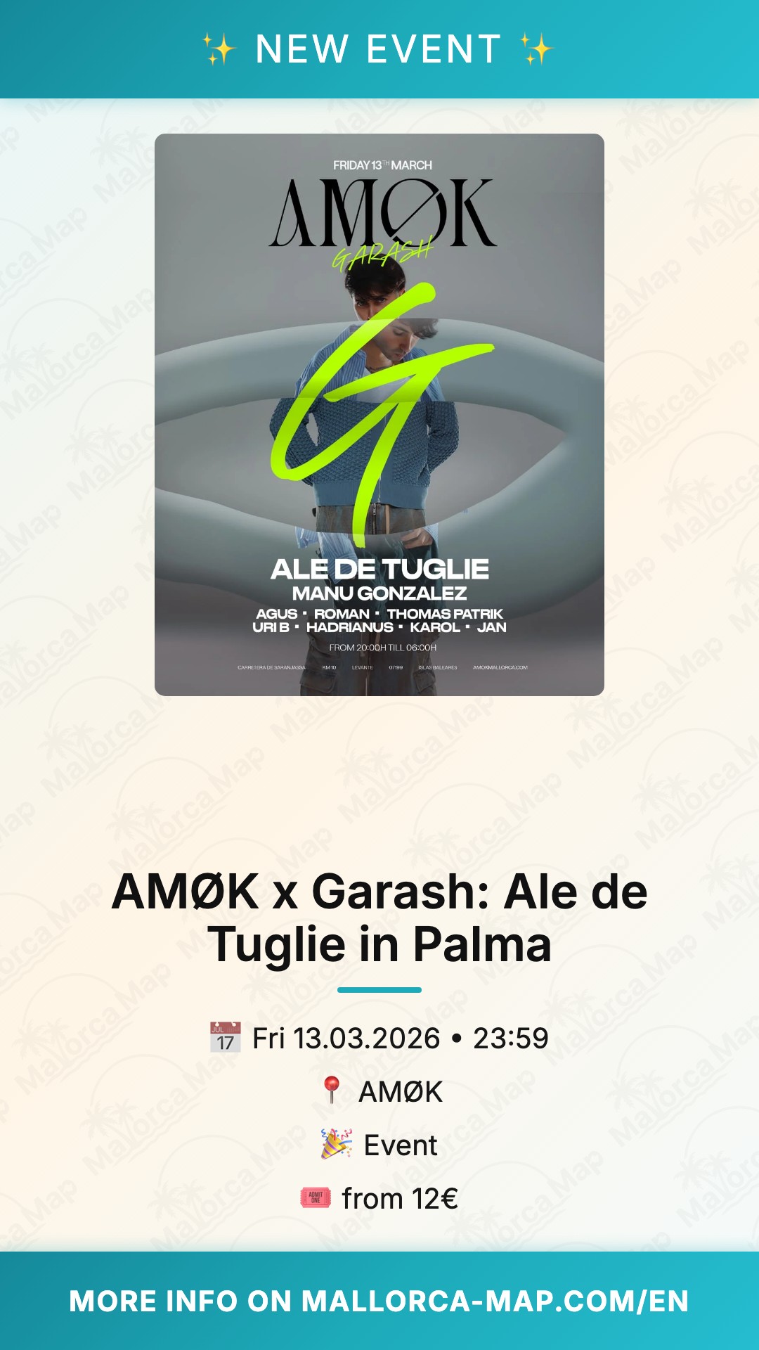 Get ready to dive into the heart of Mallorca's electronic underground. On Friday, March 13, 2026, the legendary AMØK venue in Palma opens its doors for a massive collaboration: AMØK x Garash featuring the incredible Ale de Tuglie. If you are looking for a night where the rhythm takes control and the atmosphere is electric, this is exactly where you need to be.