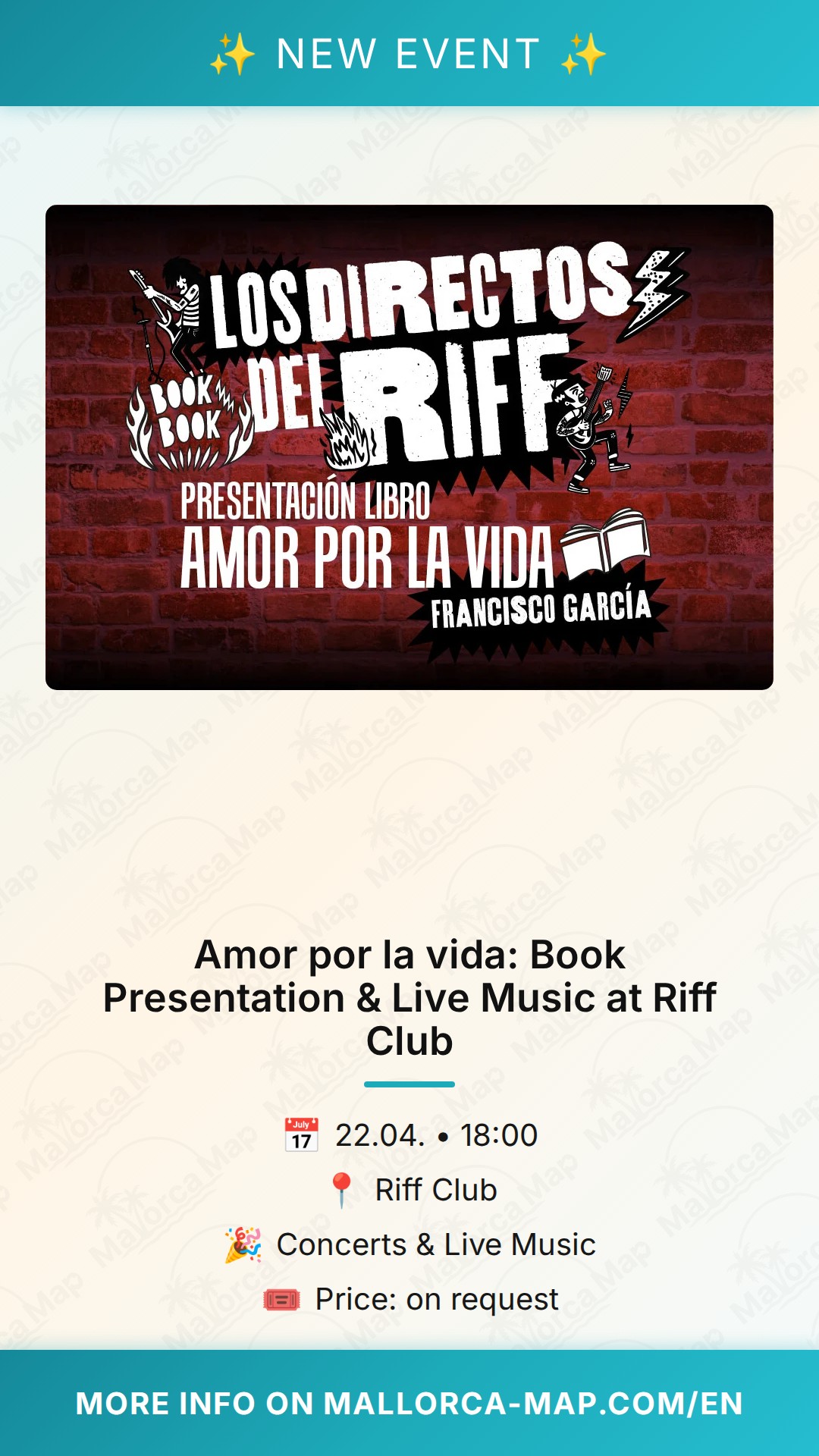 Experience a unique blend of literature and melody at the Riff Club this April 22, 2026. Join us for the special presentation of 'Amor por la vida,' an event designed for those who appreciate the intersection of heartfelt storytelling and live musical performance. Whether you are a fan of contemporary literature or simply looking for a sophisticated evening out in Mallorca, this gathering promises an intimate atmosphere where words and sounds come together.