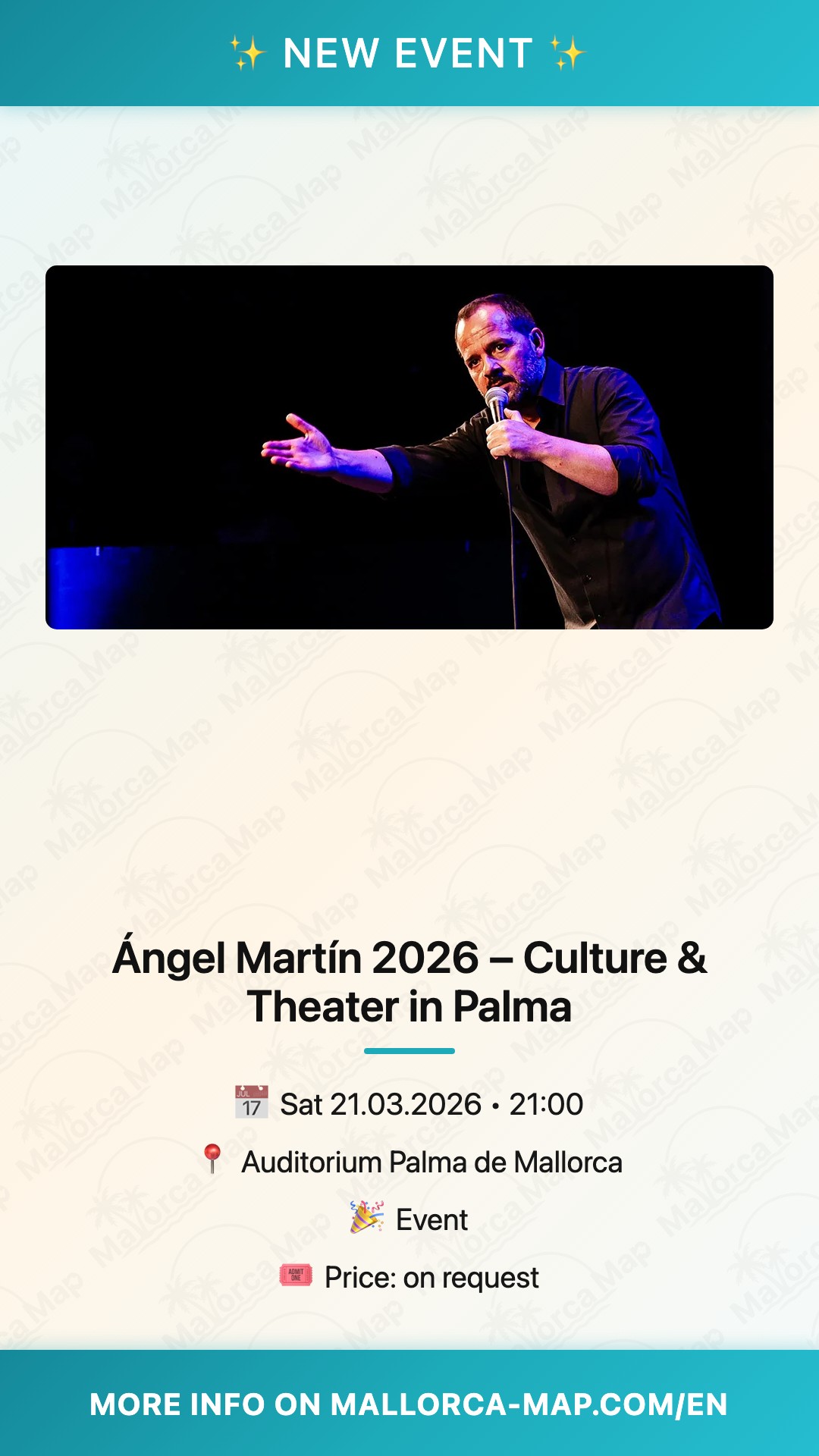 To make the most of your evening, we recommend arriving a bit early to enjoy a scenic stroll along the Paseo Marítimo before the doors open. There are several parking facilities available in the immediate vicinity, and the venue is well-served by local transport. As this is one of the most anticipated cultural events in Mallorca for 2026, securing your tickets well in advance is highly recommended to ensure the best views of the stage. Don't miss your chance to see Ángel Martín live in action—it is a cultural experience that perfectly captures the contemporary spirit of Spanish performance art.