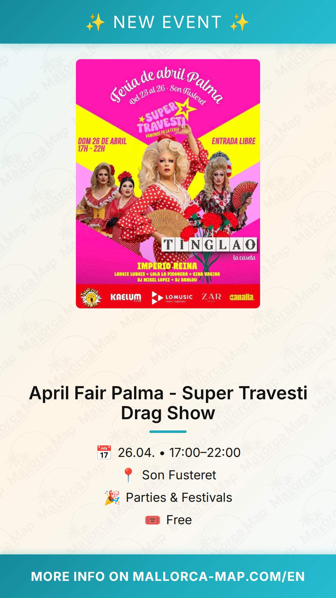 Grab your friends, put on your best fair-inspired outfit, and join us for 'Super Travesti' at the Tinglao booth. It is going to be a night of laughter, dance, and spectacular performances that you will not soon forget. See you at Son Fusteret for the most exciting Sunday of the spring season!