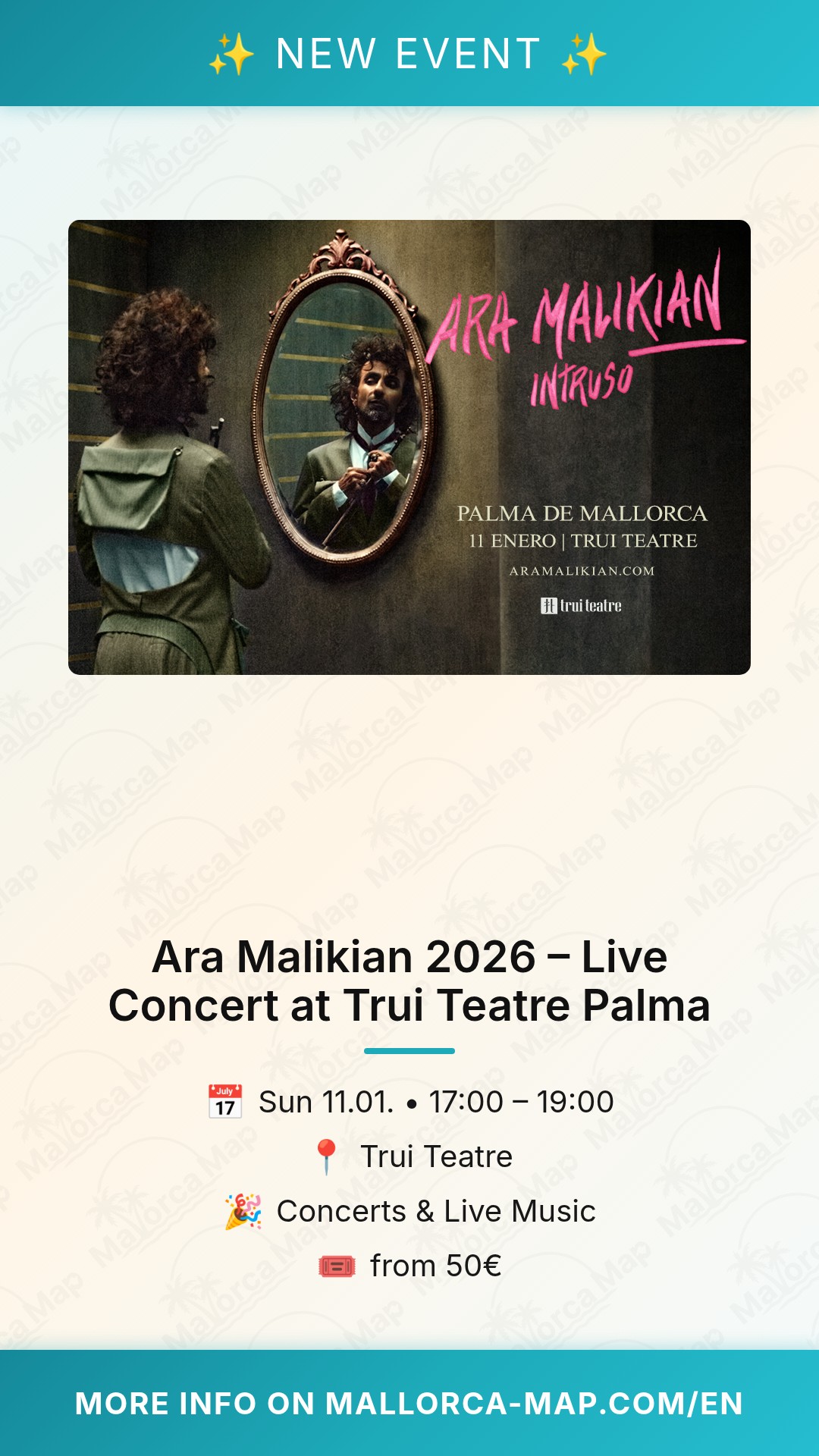 To make the most of your evening in Palma, we recommend arriving early at the Trui Teatre to enjoy the local ambiance. There is convenient parking near the venue, making it easily accessible for those traveling from across the island. Tickets for this exclusive performance are priced in the moderate to premium segment, reflecting the international status of the artist. Secure your place for this January highlight and witness a performance that will stay in your memory long after the final bow. Don't miss the chance to see a true legend live on the Mallorca stage!