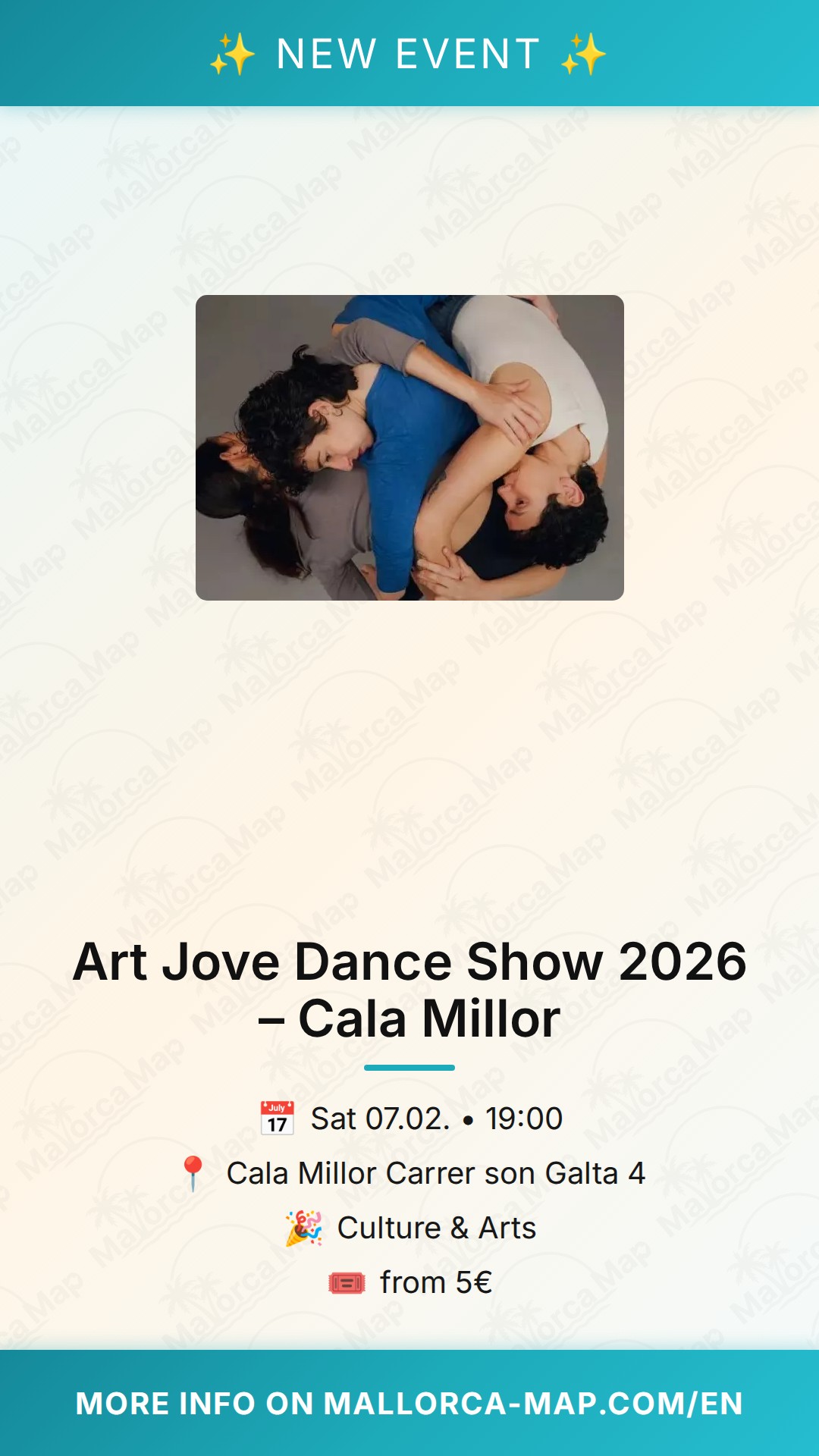 The show starts at 19:00, so make sure you arrive a bit early to find your spot and settle in. Entry is very affordable, making it a great plan for a Saturday night with friends or family. Don't miss out on this inspiring artistic event in the heart of Cala Millor. Grab your tickets soon and prepare to be amazed by the talent of Mallorca’s youth. We look forward to seeing you there for an unforgettable night of dance!