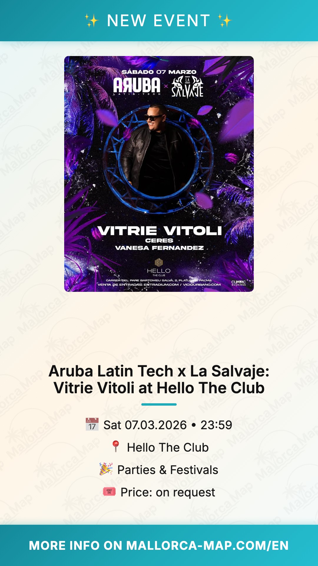 Get ready to feel the pulse of the Mediterranean as Aruba Latin Tech joins forces with La Salvaje for a night that will redefine your experience of Platja de Palma. On Saturday, March 7, 2026, Hello The Club becomes the epicenter of a unique musical fusion, bringing together the infectious energy of Latin beats with the driving force of modern tech house. If you are looking for a night where the rhythm never stops and the atmosphere is electric, this is exactly where you need to be.
