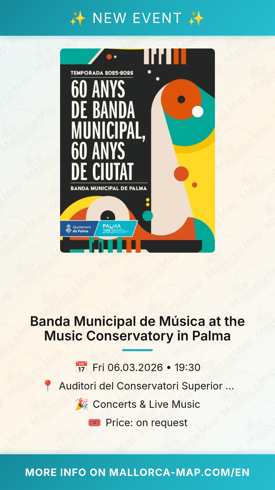 The event starts at 19:30, making it an ideal centerpiece for your evening. You might want to enjoy a light dinner in one of the nearby neighborhoods before heading to the conservatory. Remember to arrive a few minutes early to settle into your seat and perhaps read through the program notes. Whether you are a lifelong resident or a visitor wanting to experience the real Palma beyond the tourist trails, this concert offers a professional and moving musical journey. Don't miss out on this chance to support local musicians and enjoy a night of symphonic excellence in a stunning setting. See you there!