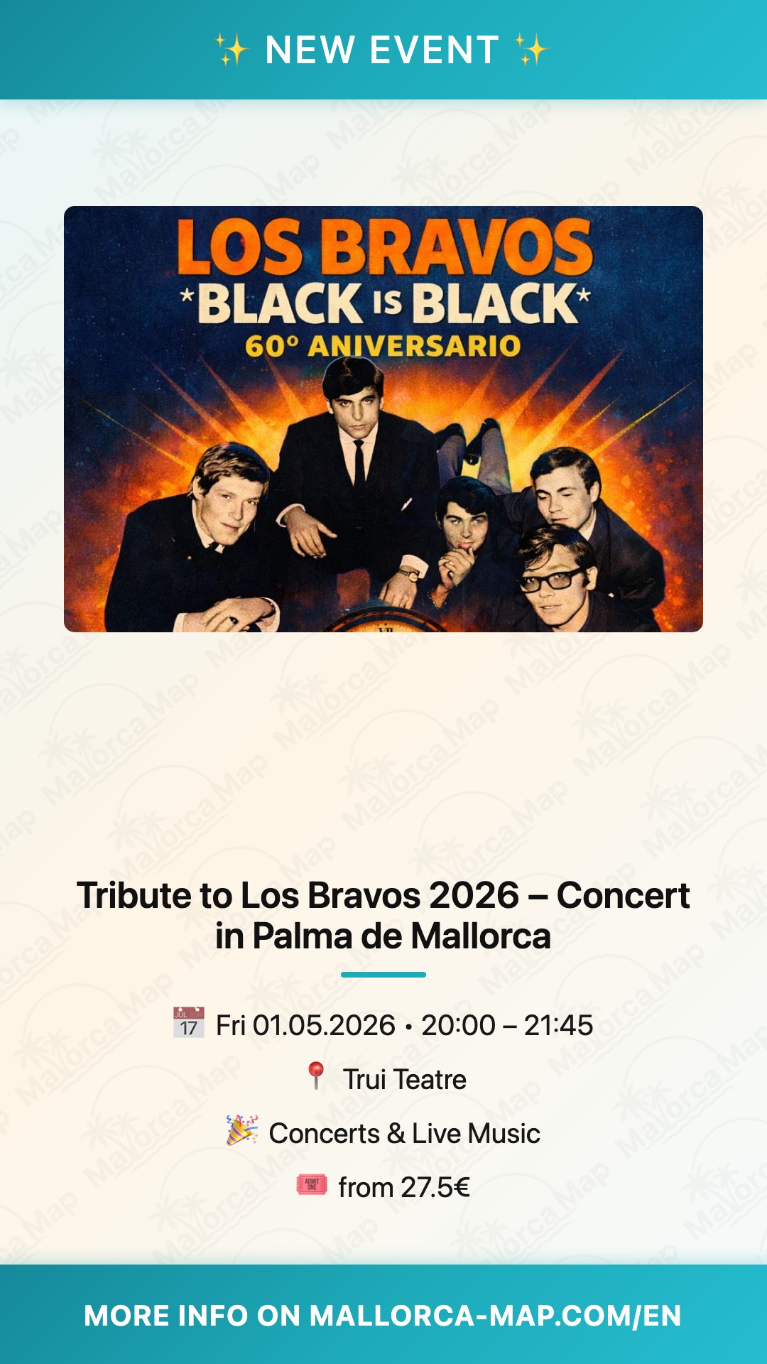 You experience a legendary night of music history at the Trui Teatre in Palma de Mallorca on May 1st, 2026. The iconic sounds of the 1960s return to the stage with the 60th-anniversary tribute to Los Bravos and their global hit, Black is Black. This isn't just a simple cover show; it’s a deep dive into the legacy of one of Spain's most successful international bands, bringing the vibrant energy of a bygone era straight to the heart of the Mediterranean for an unforgettable evening.