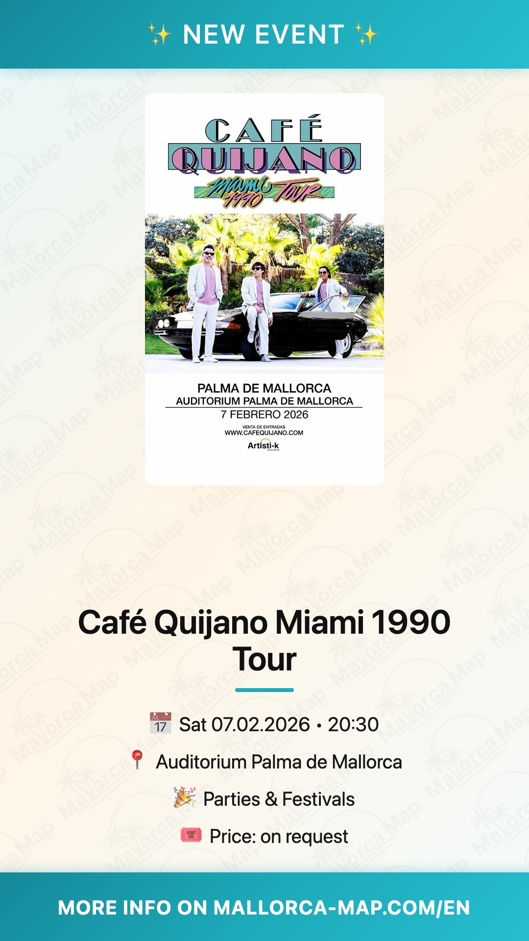 Get ready for an electrifying night with Café Quijano bringing their Miami 1990 Tour to the iconic Auditorium Palma de Mallorca on February 7th, 2026, at 8:30 PM. Nestled along Av. de Gabriel Roca, 18, in the heart of Palma, this venue transforms into a haven for live music lovers as the Spanish pop rock legends deliver their signature blend of pop rock anthems and soulful boleros. You'll feel the energy pulse through the auditorium's grand spaces, with every note echoing the band's decades of hits that have captivated audiences across Spain and beyond.