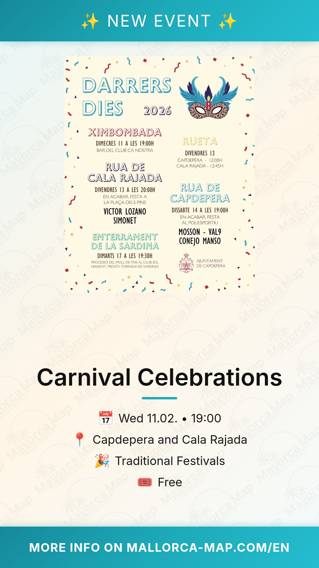 Since this is a celebration of the community, you can enjoy free entry to the main parades and public events. We recommend arriving early to Capdepera or the port area of Cala Rajada to secure a good viewing spot along the parade route. Exploring the local bars and cafes during the festivities is a great way to taste seasonal treats and mingle with the locals. Join the crowd and lose yourself in the magic of the Mallorca Carnival – an unforgettable highlight of the 2026 season!