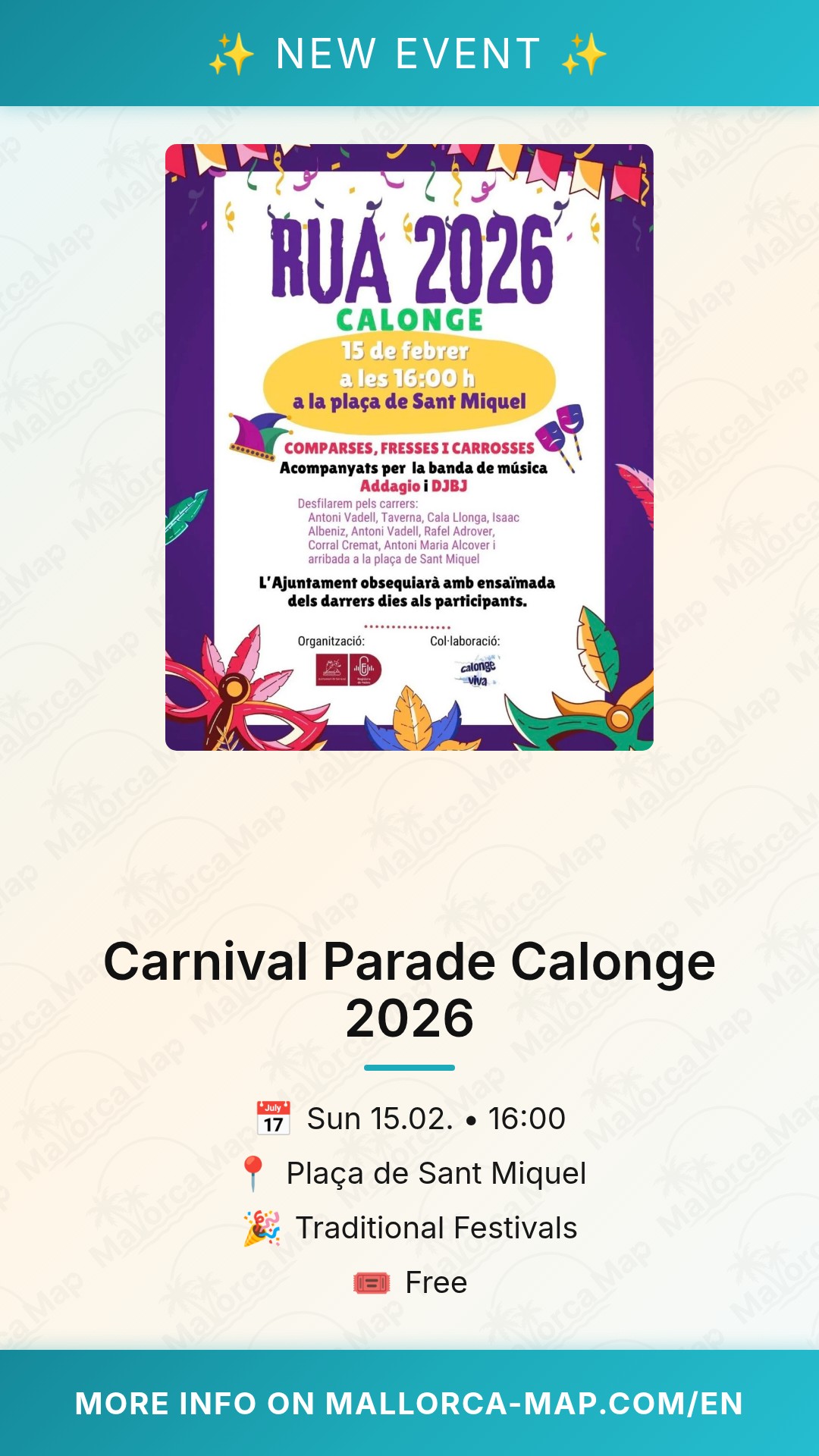 Prepare your best costumes because on Sunday, February 15th, Calonge will be filled with celebration, music, and color with the 'Sa Rua 2026' Carnival parade. Starting at 4:00 PM from Plaça de Sant Miquel, the parade of troupes, costumes, and floats will be accompanied by the Addagio music band and DJBJ. The route passes through various streets of Calonge (Antoni Vadell, Taverna, Cala Llonga, Isaac Albeniz, Rafel Adrover, Corral Cremat, and Antoni Maria Alcover), returning to the main square. Participants will be treated to traditional 'ensaïmada' by the local council. Organized by the Santanyí Town Hall and the Department of Festivities, with the collaboration of Calonge Viva.