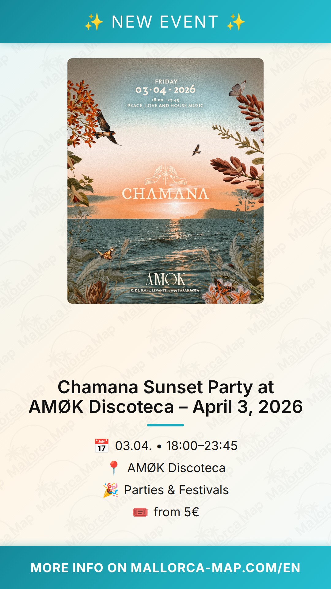 Get ready to kick off your April in style at the Chamana Sunset Party, taking place at the vibrant AMØK Discoteca on April 3, 2026. If you are looking for the perfect way to transition from a sunny Mallorca afternoon into an unforgettable night, this is exactly where you need to be. With the motto 'Peace, Love and House Music,' this event promises an atmosphere filled with positive energy, high-quality beats, and the kind of sunset vibes that only this island can offer.