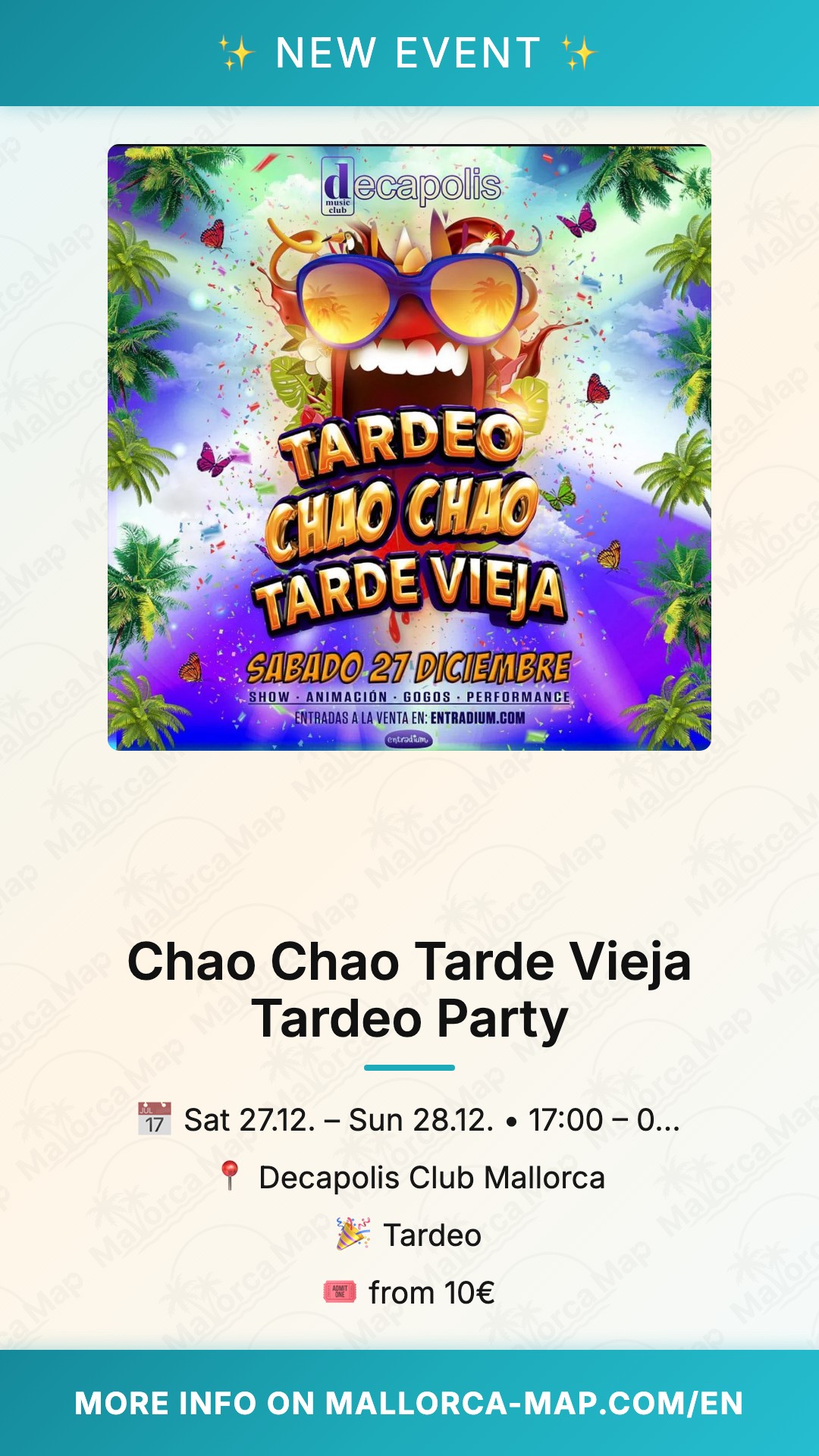 Dive into the vibrant energy of the Chao Chao Tarde Vieja Tardeo Party on December 27th, 2025, starting at 5 PM at Decapolis Club Mallorca. This afternoon-to-evening bash captures the essence of Mallorca's lively tardeo culture, blending non-stop beats with festive vibes just before New Year's. Expect an afternoon filled with high-energy performances and seamless transitions into evening revelry, perfect for kicking off the holiday season in style.