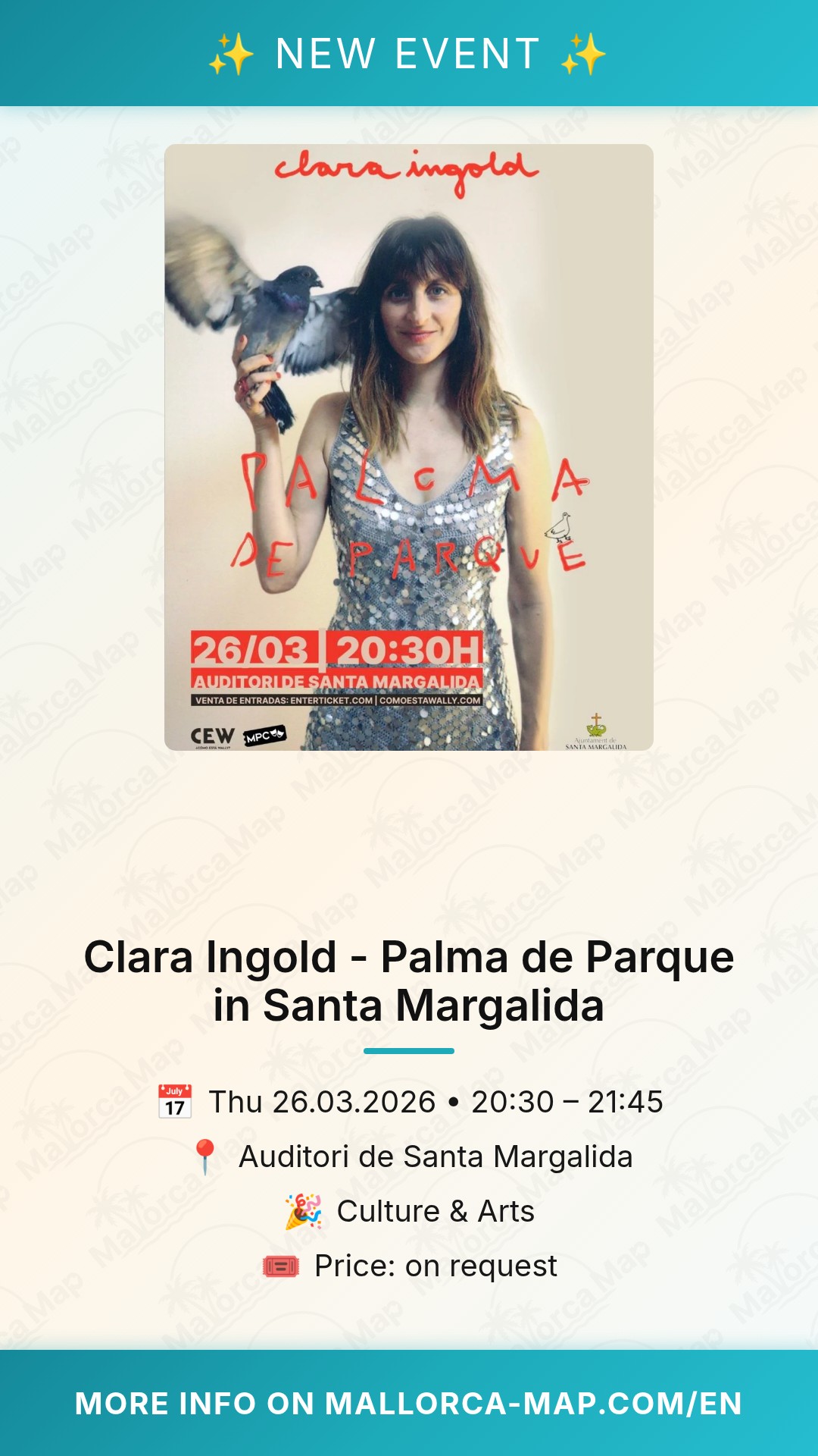 Welcome to a night of artistic brilliance in the heart of Mallorca. If you are looking for a unique cultural experience, you cannot miss Clara Ingold's performance "Palma de Parque" at the Auditori de Santa Margalida. This event promises to be more than just a play; it is an exploration of creativity and emotion that will leave you thinking long after the final curtain call. Santa Margalida, a charming town known for its authentic Mallorcan spirit, provides the perfect backdrop for this contemporary artistic showcase.