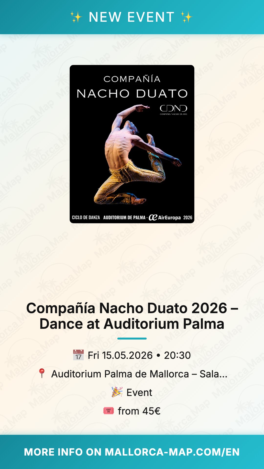 You will experience a night of unparalleled grace as the Compañía Nacho Duato takes the stage at the iconic Auditorium Palma de Mallorca on May 15, 2026. Located along the scenic Av. Gabriel Roca, this performance is a cornerstone of the Ciclo Danza, bringing world-class choreography to the heart of the Mediterranean. This evening promises to be more than just a show; it is a celebration of movement and deep emotion that will leave you breathless under the lights of the prestigious Sala Magna.