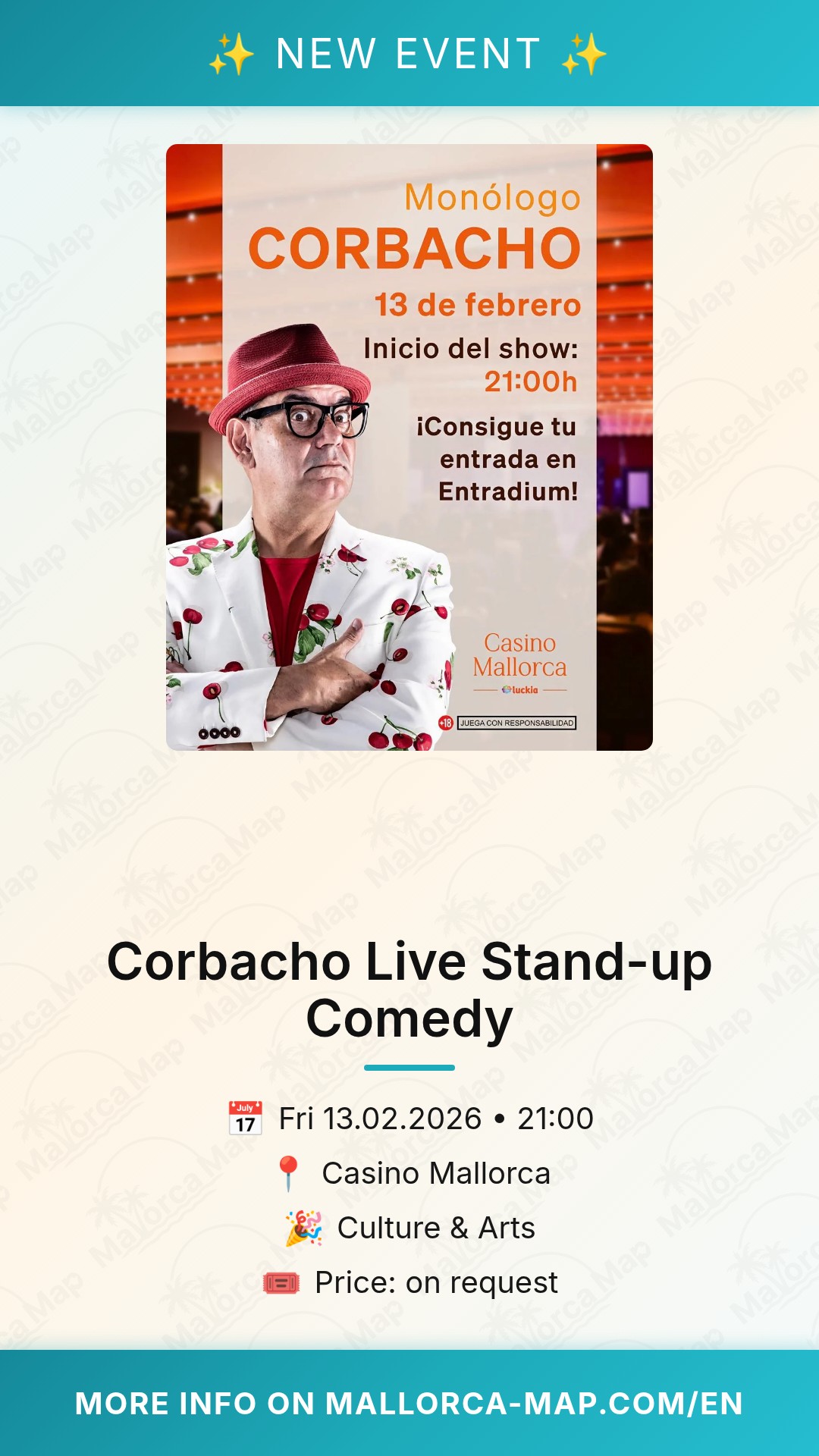 You experience a night of side-splitting laughter as Corbacho Live Stand-up Comedy arrives at the prestigious Casino Mallorca on February 13, 2026. Set within the bustling Porto Pi Centro on the scenic Avinguda de Gabriel Roca, this performance is set to be one of the most anticipated events in Palma de Mallorca this February. José Corbacho, a titan of Spanish comedy, brings his latest show to the island, offering a refreshing and hilarious perspective on life that resonates with everyone. The energy in the room starts building long before the first joke, as fans gather in one of the city's most iconic leisure hubs for a night of top-tier entertainment.