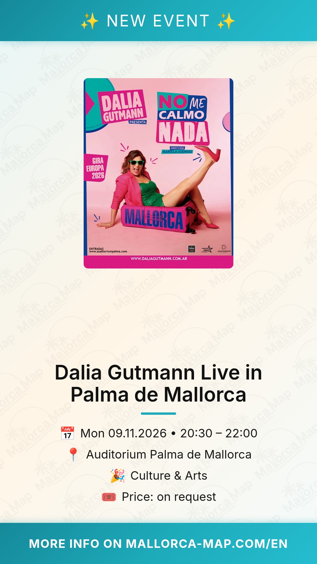 The show starts at 20:30, making it the ideal centerpiece for your evening in Palma. You could start with a sunset stroll along the harbor or enjoy some tapas in the nearby Santa Catalina district before heading to the theater. This performance is a fantastic opportunity to engage with international talent while soaking up the local cultural scene. Make sure to secure your seats early, as Dalia Gutmann’s shows are known to draw enthusiastic crowds. Bring your friends, enjoy the wit, and let yourself be carried away by an evening of top-tier entertainment in one of Mallorca’s most prestigious venues.