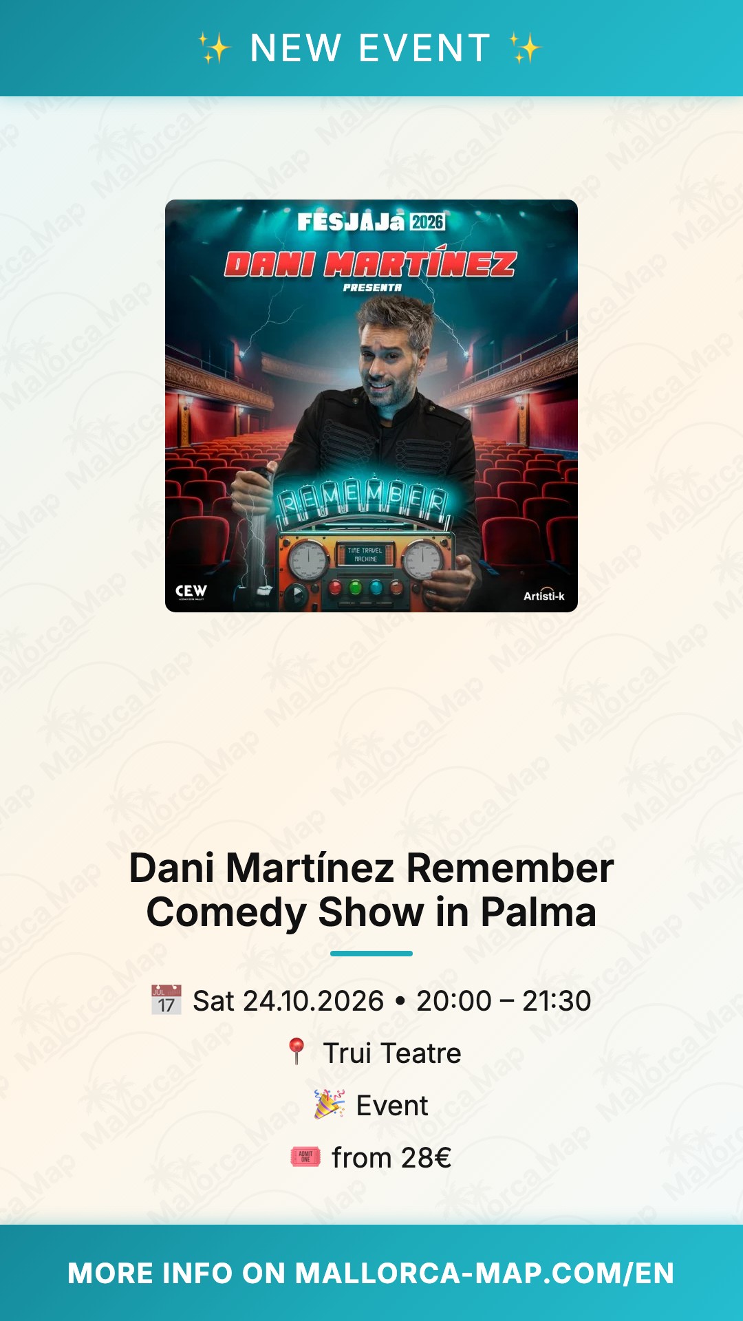 Are you ready for a night of non-stop laughter? The XVII Fesjajá comedy festival brings you the incredible Dani Martínez Remember show to the heart of Palma this October. On Saturday, October 24th, you have the chance to experience one of Spain's most beloved comedians live on stage. This performance is one of the main highlights of the season, blending nostalgia, impressions, and modern wit into a unique comedy experience that you simply cannot miss.