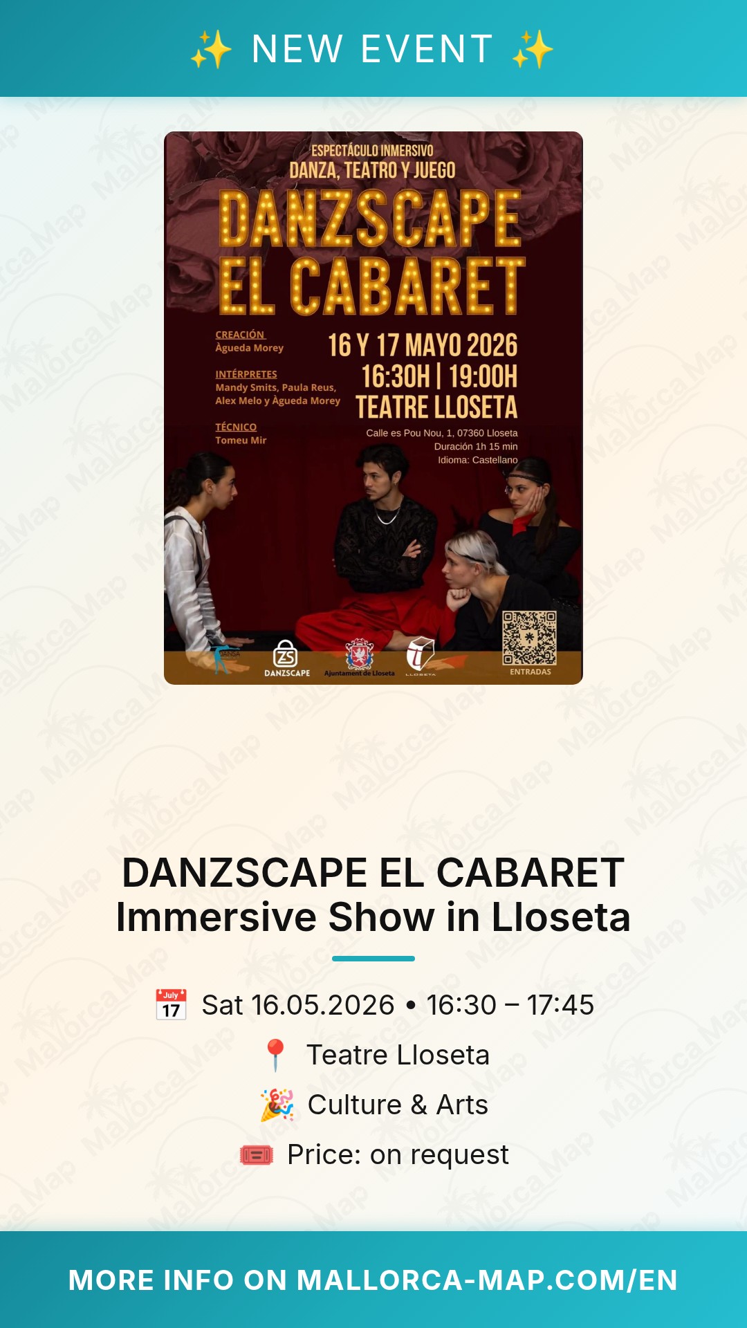 Are you ready for a performance that breaks the fourth wall? On May 16, 2026, the Teatre Lloseta opens its doors for a truly special event: DANZSCAPE EL CABARET. This isn't your typical sit-and-watch theater piece. Instead, you are invited into an immersive world where dance, theater, and play collide in a 75-minute spectacle that will challenge your senses and spark your imagination.