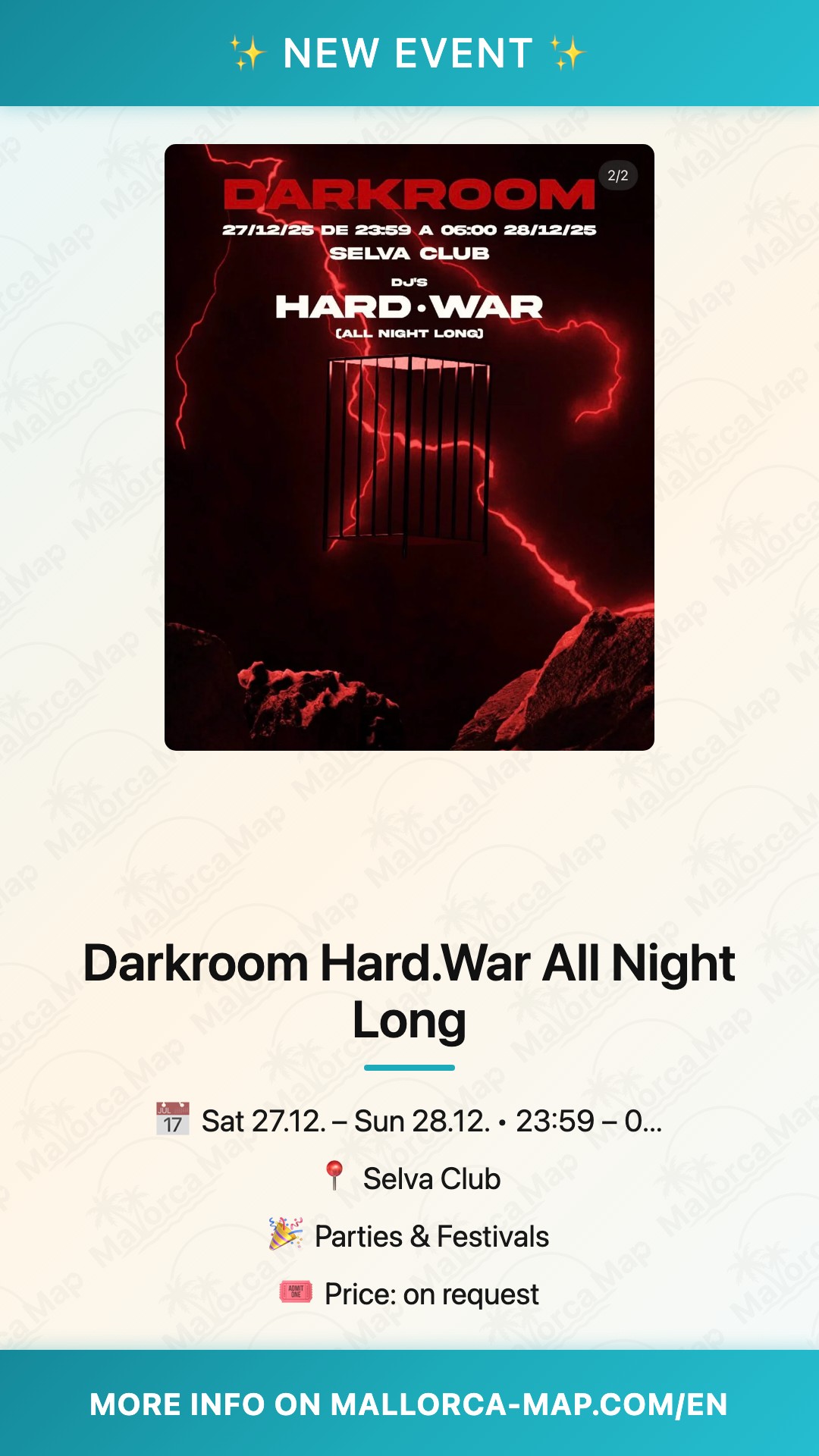 Dive into the intense world of Darkroom Hard.War All Night Long at Selva Club in Palma de Mallorca on December 27, 2025. Starting at midnight, this techno extravaganza pulses through the night until 6 AM the next day, delivering unrelenting Schranz and hard techno beats that will test your limits. Nestled in the heart of Palma's vibrant nightlife scene, Selva Club transforms into a dark, immersive haven where the music never stops, drawing ravers from across the island for an unforgettable all-night journey.