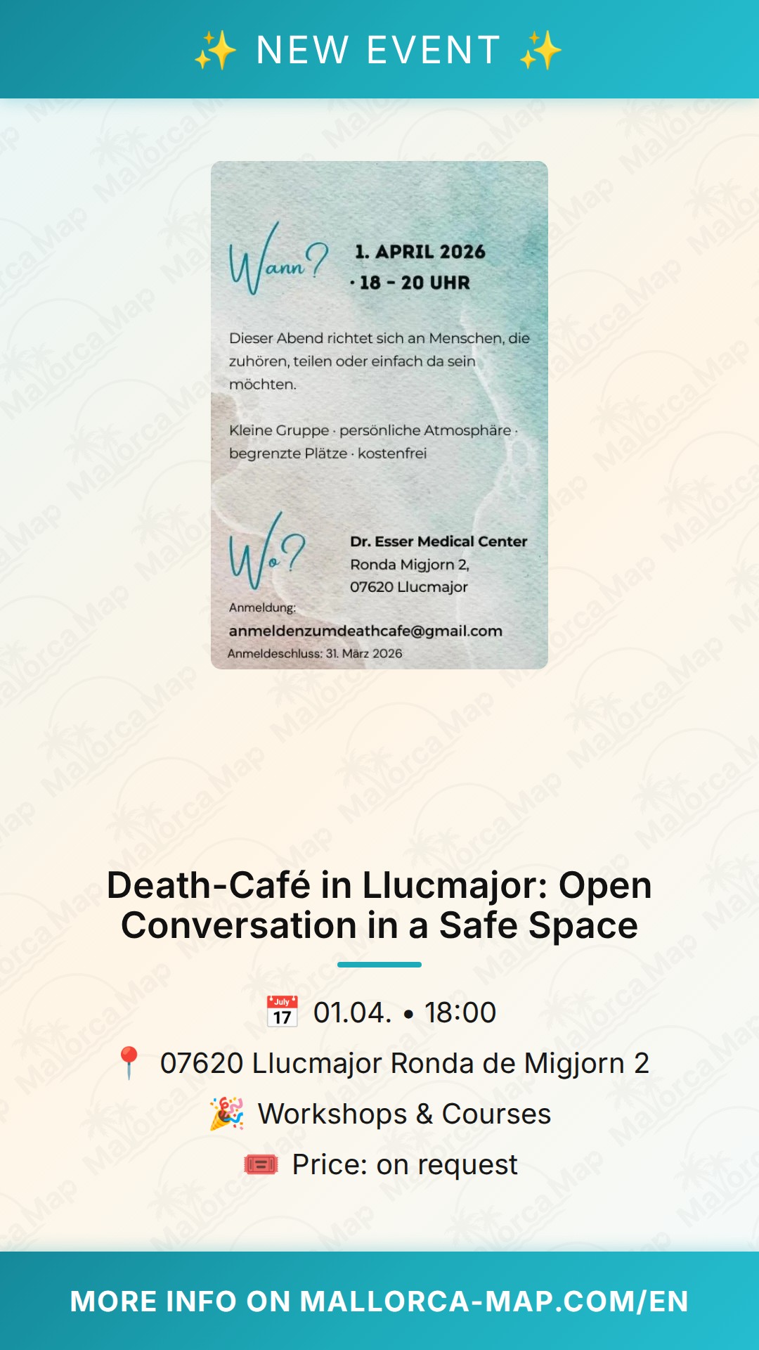 Attending this Death-Café is completely free of charge, reflecting our commitment to fostering community connection and open dialogue in Mallorca. However, due to the limited capacity, prior registration is mandatory. Please confirm your attendance by sending an email to anmeldenumdeathcafe@gmail.com no later than March 31, 2026.
