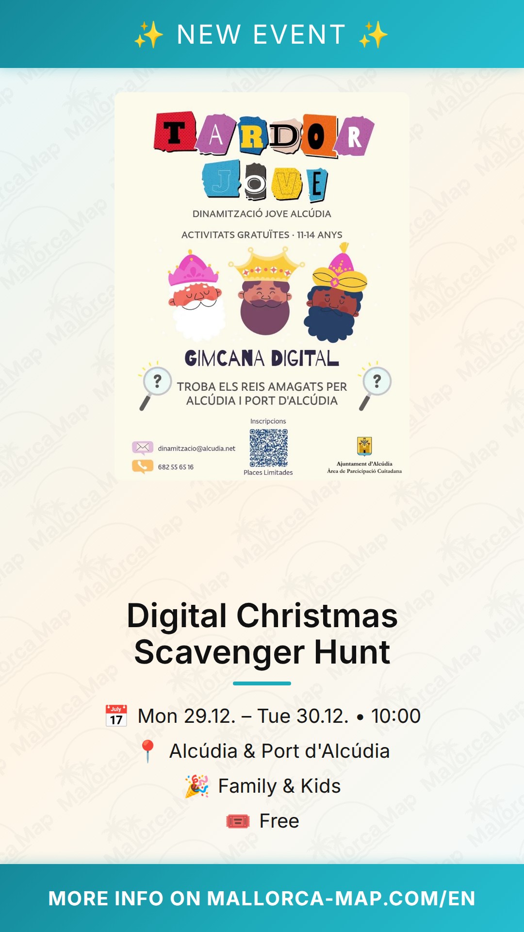 Grab your devices and head to Alcúdia & Port d'Alcúdia for this no-cost delight. It's an ideal way to kick off your Christmas adventures on the island – download the app, start at 10:00, and let the hunt begin. Don't miss out on this unique blend of tradition and technology!