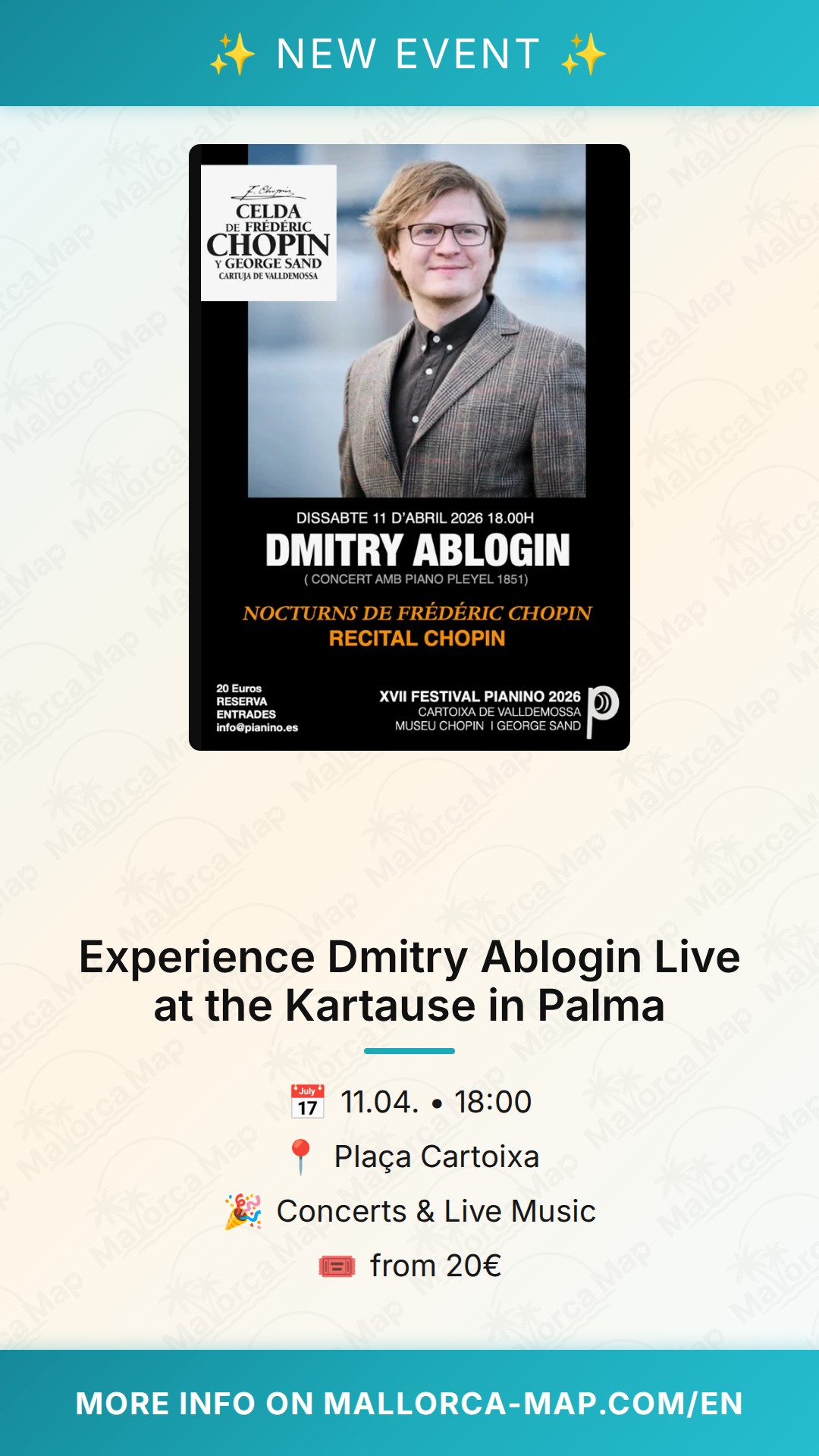 Dmitry Ablogin is widely celebrated for his profound musical sensitivity and his ability to breathe new life into classical masterpieces. Watching him perform in the heart of Palma is a rare opportunity to witness technical brilliance coupled with deep emotional expression. The setting of the Kartause provides the perfect acoustic and visual environment, allowing the music to resonate in a way that feels both timeless and deeply personal. Whether you are a dedicated follower of Ablogin’s work or simply looking for a sophisticated way to spend your Saturday evening in the city, this concert offers the perfect blend of cultural depth and local charm.