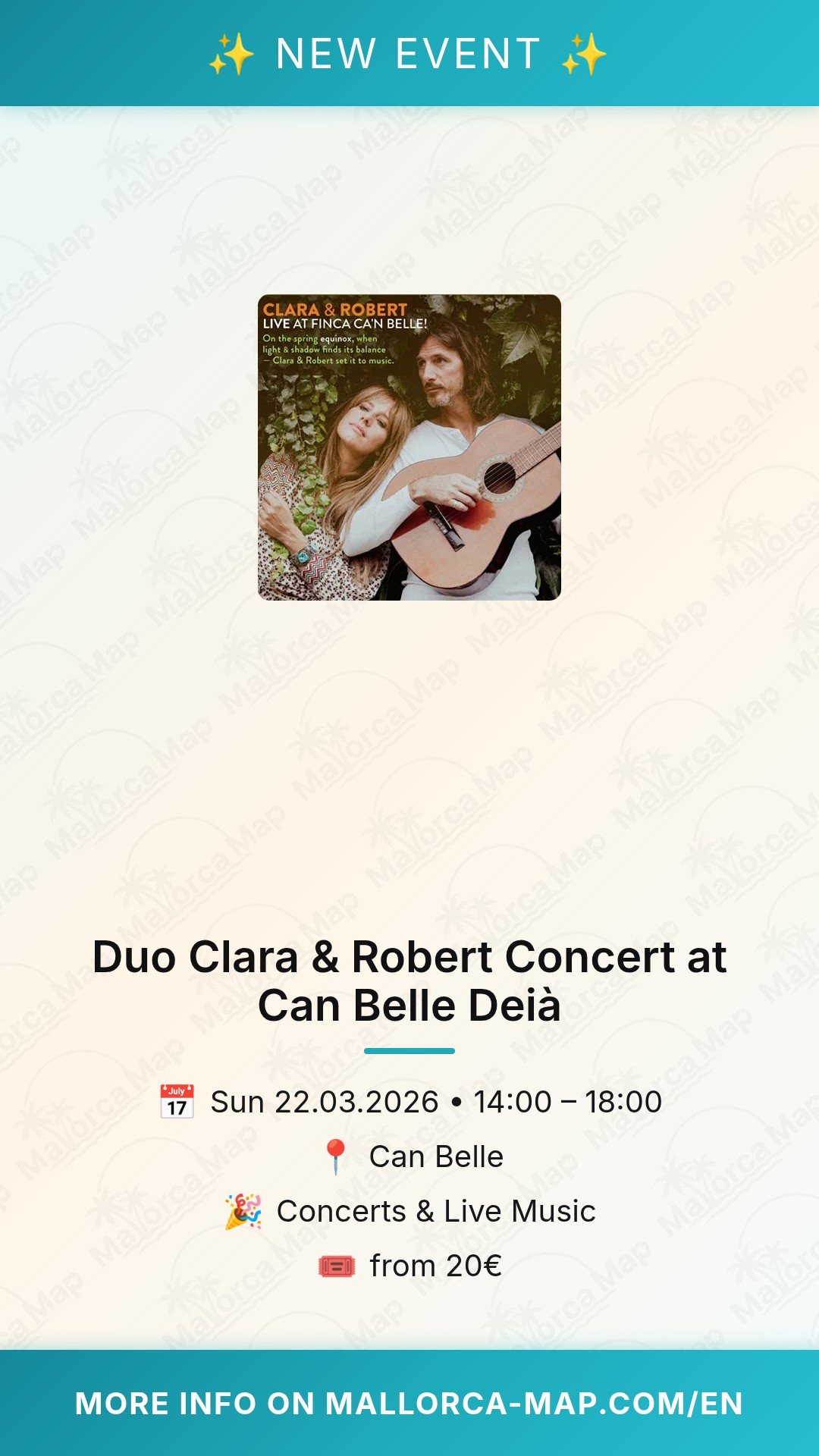 Don't miss out on this soulful start to the spring. Since the exact location in the Urbanización Bens d’Avall is shared via WhatsApp upon booking, make sure to reach out to organizer Waltraud Mucher to secure your place. Parking is conveniently available on the street leading to the house. Grab your tickets now, pack a snack, and get ready for an unforgettable musical journey with Duo Clara & Robert in the beautiful surroundings of Deià.