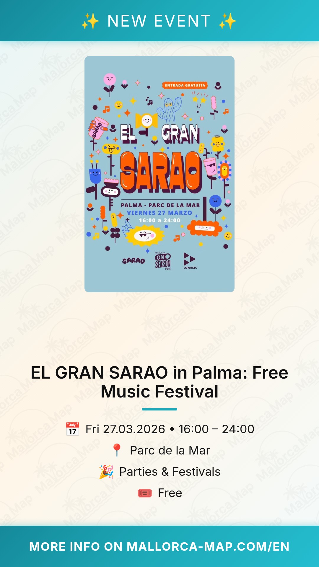 Make sure to arrive early to grab a good spot and fully immerse yourself in the music. Since the event starts in the late afternoon, you’ll get to witness the transition from the golden hour to the sparkling city lights of Palma. It’s a fantastic opportunity to meet new people, support the local cultural scene, and enjoy a day out without spending a dime on tickets. Grab your sunglasses, bring your best energy, and see you at Parc de la Mar for EL GRAN SARAO!