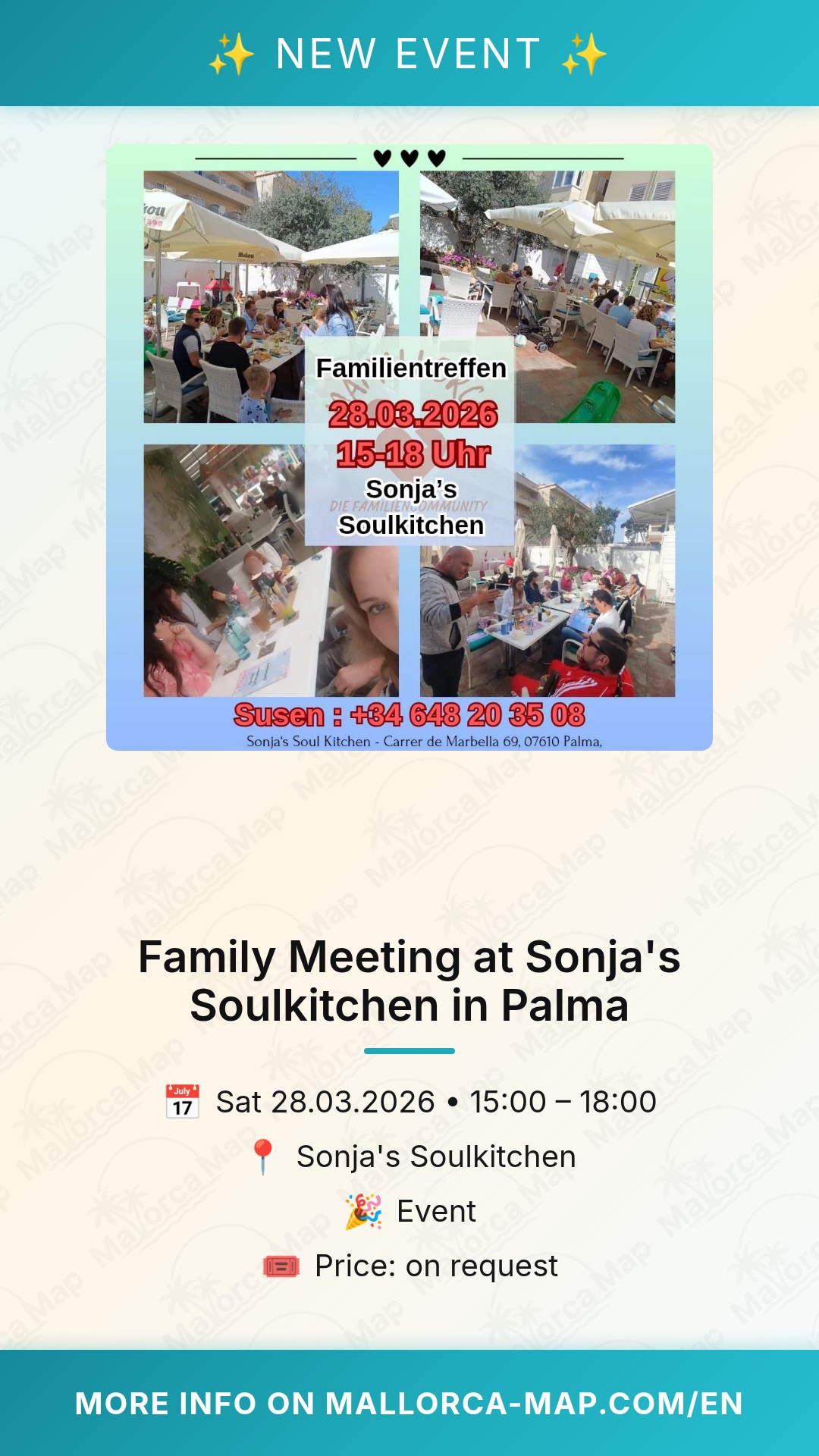 The event starts at 3:00 PM, making it the ideal Saturday afternoon activity. You can enjoy the unique culinary touches that Sonja's Soulkitchen is famous for while soaking in the Mediterranean sun and the buzz of happy conversations. It is more than just a meeting; it is a chance to strengthen the bonds of the international and local family community in Palma. Bring your energy, your smiles, and your family to Carrer de Marbella for an afternoon that celebrates the joy of being together. We look forward to seeing you there and making this a memorable day for everyone involved. Don't miss out on this chance to connect with the heartbeat of the local family scene!